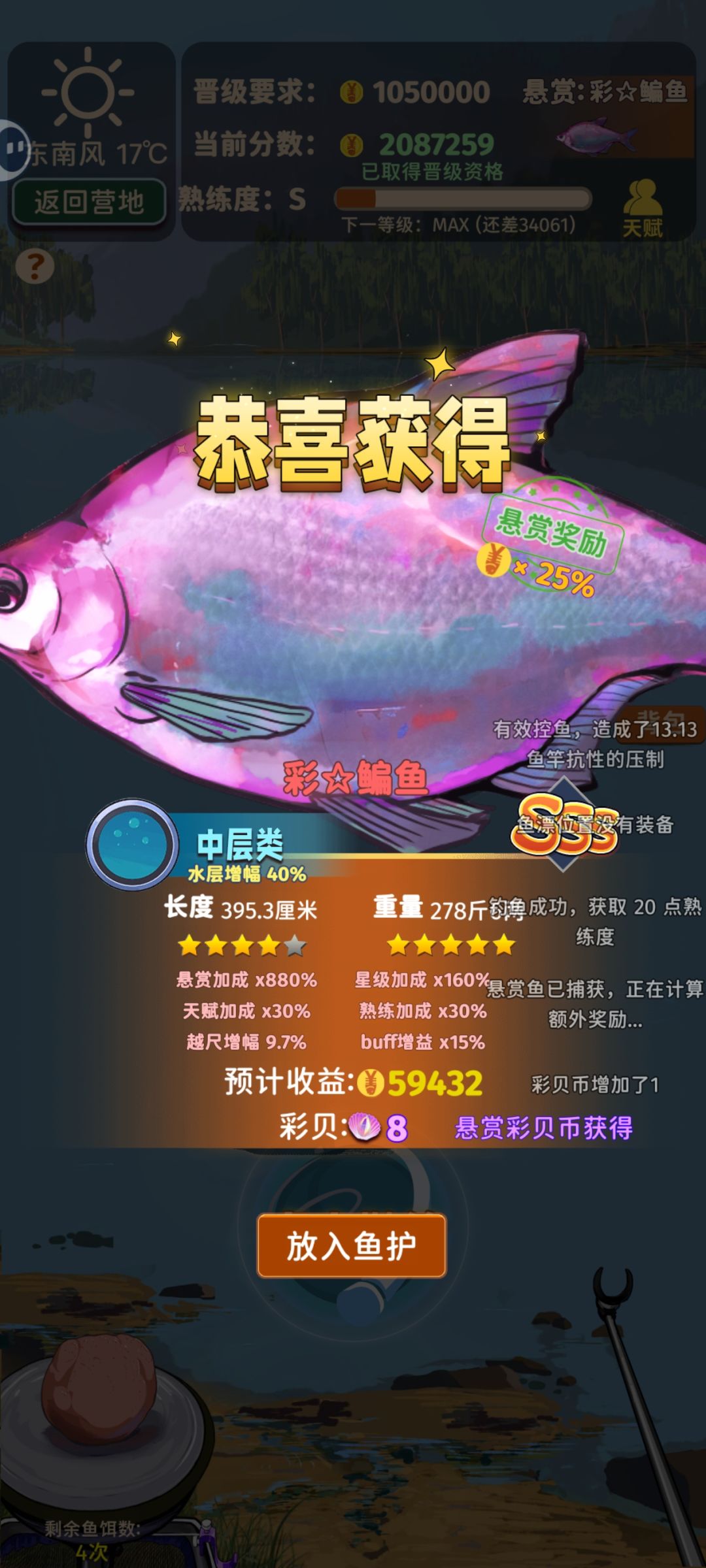 分享一个很重要的进阶点给新手,这个游戏是有漂相和放口一说的。 漂相:每种鱼都有固定的几种漂相,比如,白条和一些小鱼会把漂拽跑。草鱼会轻点然后一口吞等等。 放口:抛竿以后其实有三次机会钓鱼,并不是说来了口就必须钓,如果你会看漂相,我们就可以把不值钱的鱼放过去,让它吃一些饵不钓,然后再座钓,以达到高收益,对走赏金猎人的玩家尤为重要,如果你看漂炉火纯青,甚至能在只有 30% 悬赏鱼必出的条件下把把都钓到