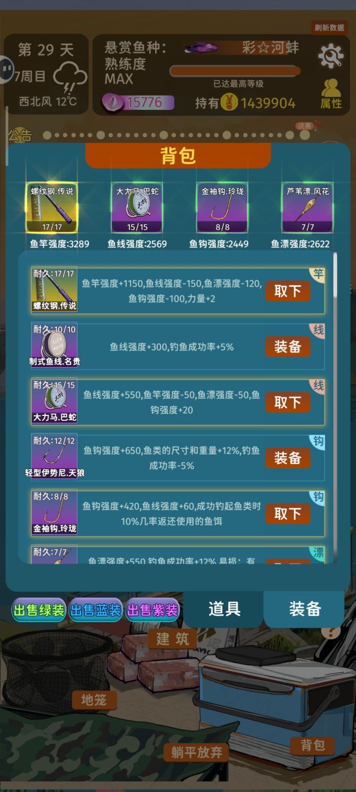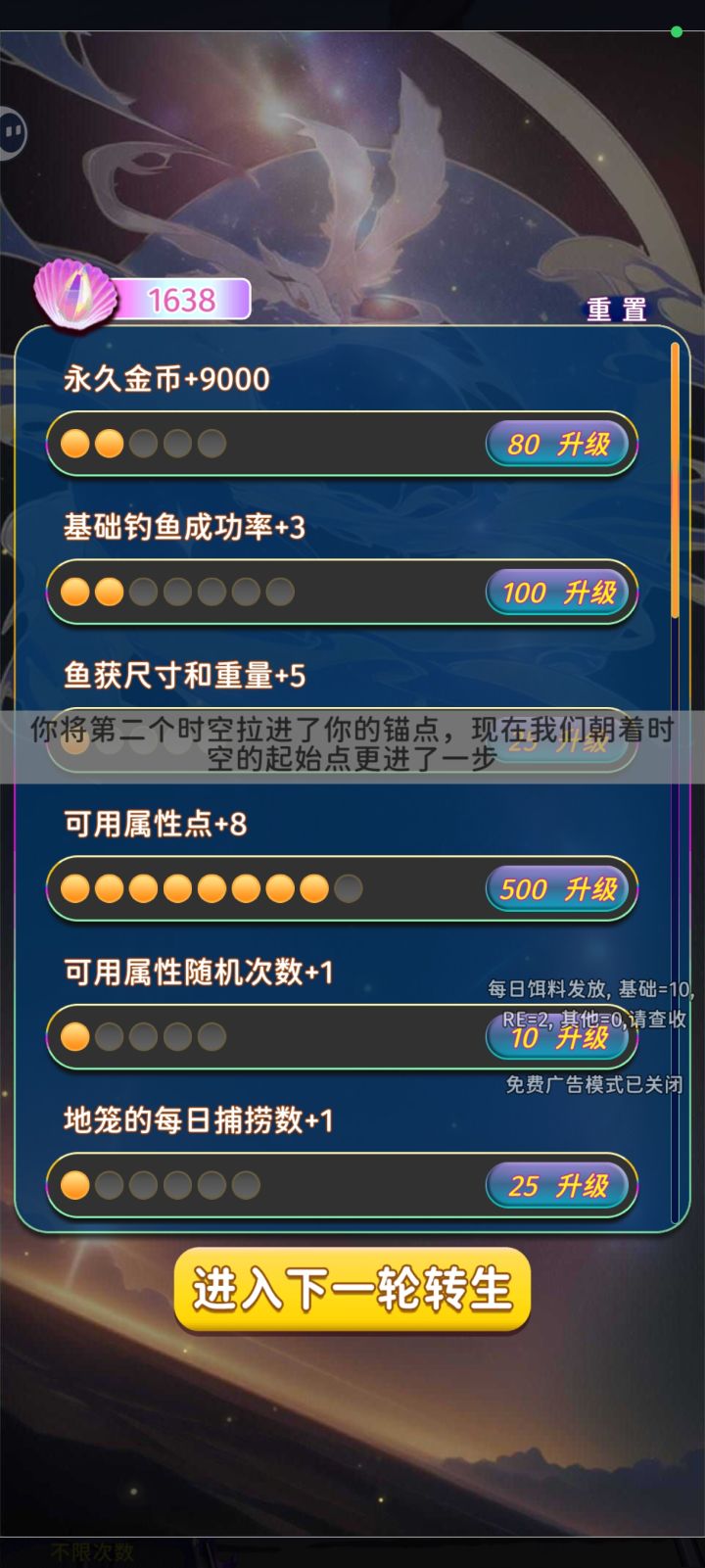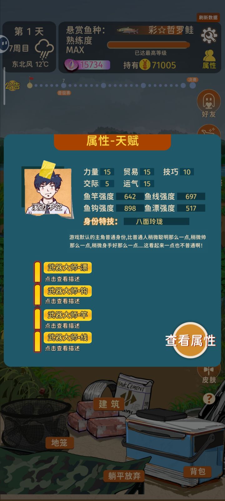 玩了一个多星期,先是卡在一周目。后来群友指导,用优雅战斗+打窝大师+什么都能钓+赏金猎人,一次性过关了1-3周目。前3周目,解决了赚钱问题后,商店各种买,装备4金装就都没问题了。然后在四周目卡了很久,2000+的杆子强度,都直接被第七轮的神话鱼秒切。结合群友和作者的经验,作了几次尝试,今天侥幸过关。不成熟的经验分享给大家:1.天赋选择:硬拉之王+武器大师(线)+武器大师(漂)+鱼竿强化(+200