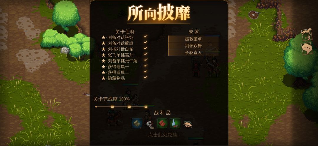 大家好,我是雨田!挑战困难100% 第八关 董卓救援战 剧情!然后就是出战,这里可以整理一下物品!然后存档,出战! 这关分为两段!也要猛打,刘备加好【集中】buff,张飞和二爷要使劲砍,刘备,简雍补刀收经验!张飞和高升的单挑任务,刘备和张纯的对话任务在第一段!第一段没有物品收! 第二段开始后,张飞或者关羽打开路,然后刘备跟着往董卓老贼这里冲!14回合内冲到他身边触发任务!否则就不能100%! 第