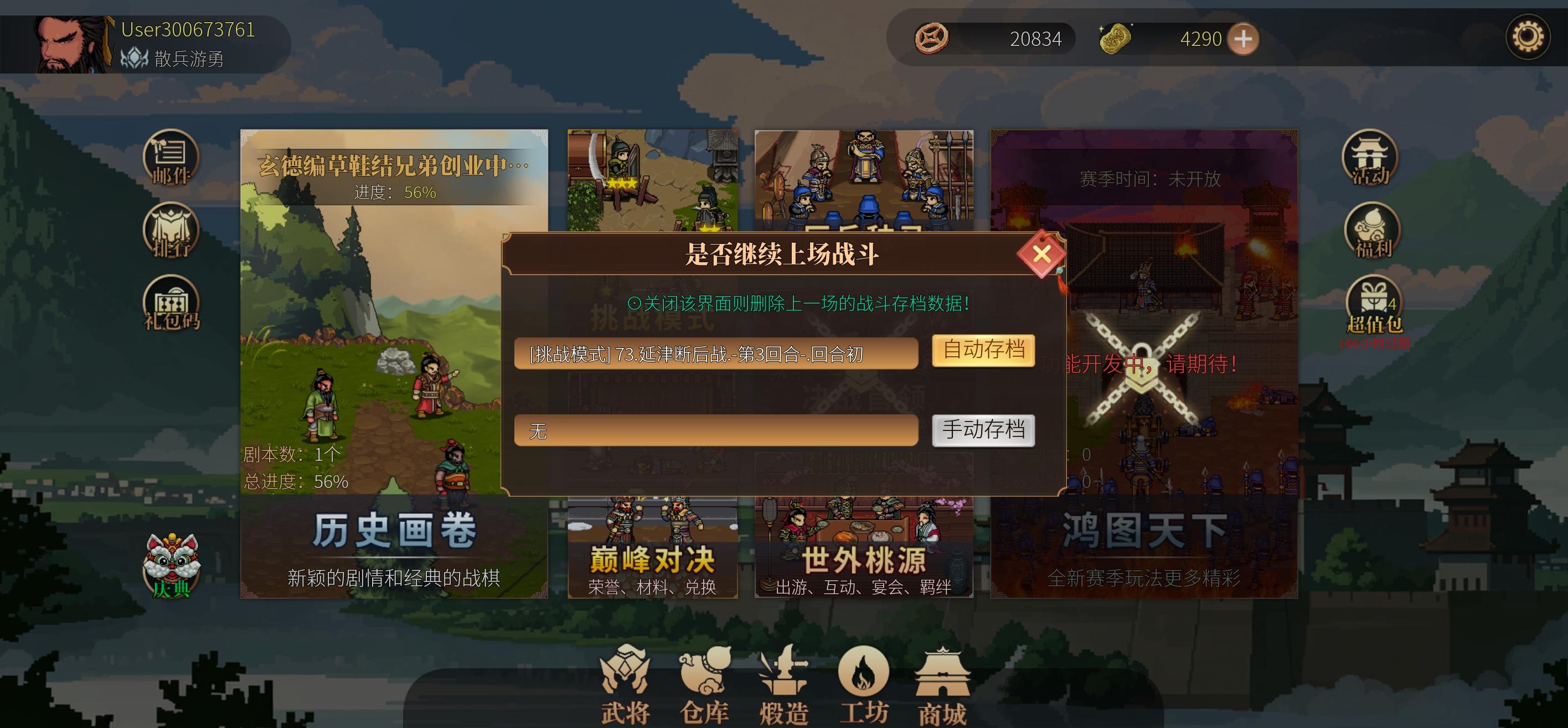 0.剧情模式里可以锻造武器,不过需要我军平均等级达到一定等级才能锻造一次武器。锻造有两个地方:(1)自由行走大地图里的铁匠铺旁边的商人。(2)出站的时候有个“军需”,点击之后有个“锻造”1.目前是测试阶段,测试7天,从11号到17号。删档测试。2.目前分两个模式,新人进去就是“剧情模式”,需要打2关,然后保存完重进游戏,最开始的主菜单栏下面会出来一个新的选项“返回历史画卷”的选项,可以转