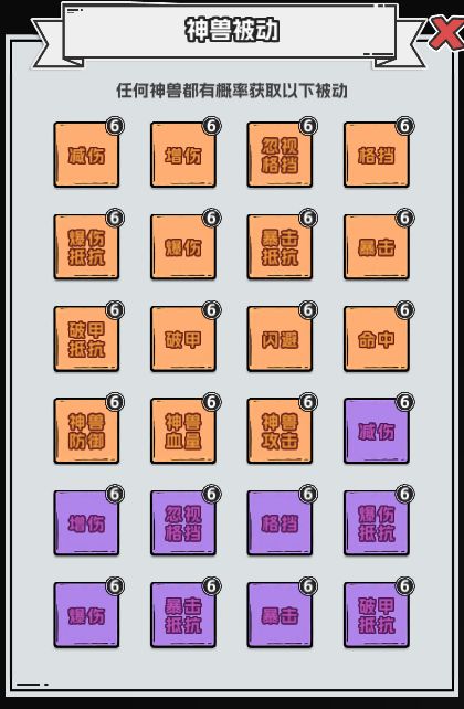 一:神兽玩法1、上阵之后神兽加成和被动技能才会生效,神兽属性100%增加到英雄上。后续开放主动技能,为战斗带来更多箫略;2、专属神兽只能被指定英雄上阵,其他英雄无法上阵;3、重复获得的同名神兽可以作为升星材料被消耗,升星成功会提升神兽的属性加成和被动技能;4、消耗高星的神兽会额外提升星级,不会有损失;5、神兽的星级上限为20星,被动技能等级上限为6级;6、当前神兽加消耗的高星神兽升星后