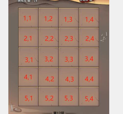 闯王宝藏线索(+ -乘除)破解思路,横纵格子坐标相互加减乘除,格子是4x5,总共20个格子。因为格子限制,算式前面的数最大是5,所以算式有6以上的成立算式,也是不成立的,以下大致解法。列出所有可能成立的小学生数学算式,算式前面两个数组合成坐标,就是解题答案!其一系列具体看下面。坐标读取参考(竖,横),对应数学算式前面两个数。解读:竖:竖着往下数第几个,横:竖着数完后,在此基础上,横着数第几个。具体