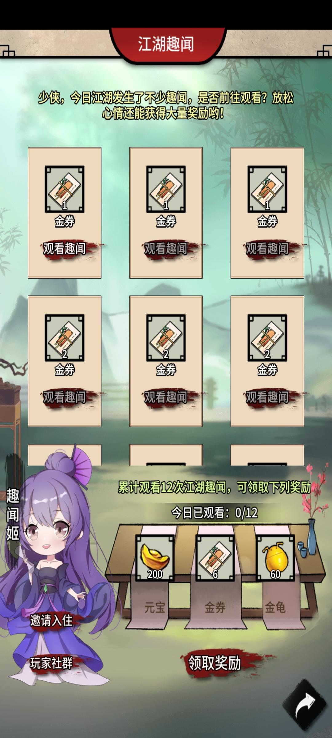 各位少侠,每逢周五精神爽!!!盖楼抽奖活动来啦!!!!【活动时间】8月15日11点开奖!【活动奖励】免广告卡(免广告卡终生有效,可以免除游戏内所有广告并解锁强力5星侠客趣闻姬,共抽奖3人,中奖后请加入玩家QQ群:690045637,联系群主“老夫子”领取。如果已有免广告卡,则奖励兑换为100金券)【参与方法】回帖参与盖楼,说说你对游戏的评论,即可参与抽奖哦!
