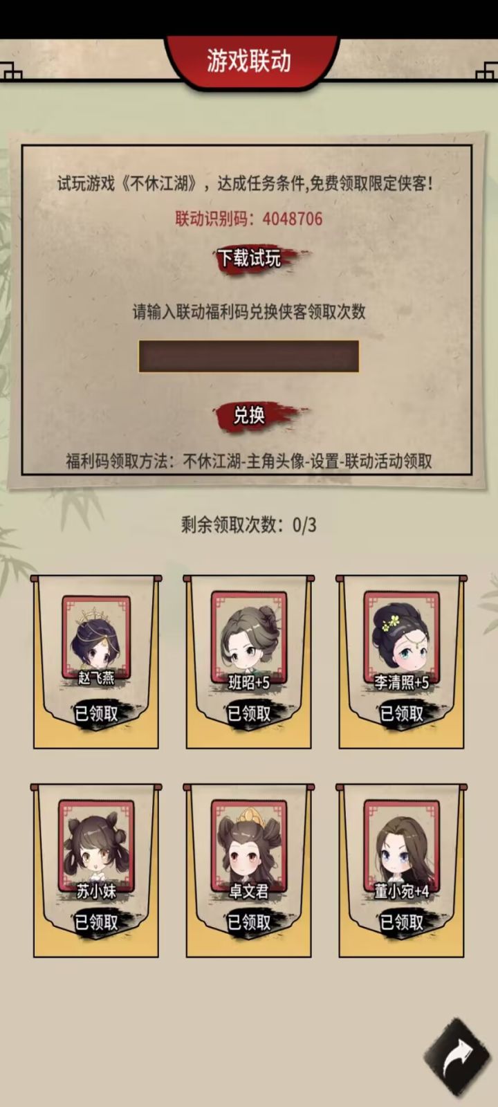 各位少侠,游戏今日上了一个联动福利哦!下面联动福利码,可通过试玩我们团队开发的另一款《少年侠客》获得另外3个联动福利码!少年侠客下载链接:联动活动任务:(1)掌门破镜1级,1个福利码(2)掌门破镜30级,1个福利码(3)掌门破镜60级,1个福利码福利码领取方法:《少年侠客》游戏中,掌门头像,设置,联动活动入口领取!下面《何不闯江湖》联动活动页面,暂时未更新联动说明,属于隐藏款福利
