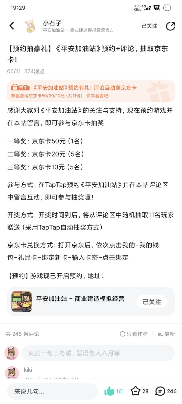 十几天了。发的被绑定的京东卡还是没回复,就这么办活动吗?【预约抽豪礼】 《平安加油站》预约+评论,抽取京东卡!https://www.taptap.cn/moment/681809625078563196?share_id=29610920ba88&utm_medium=share&utm_source=copylink