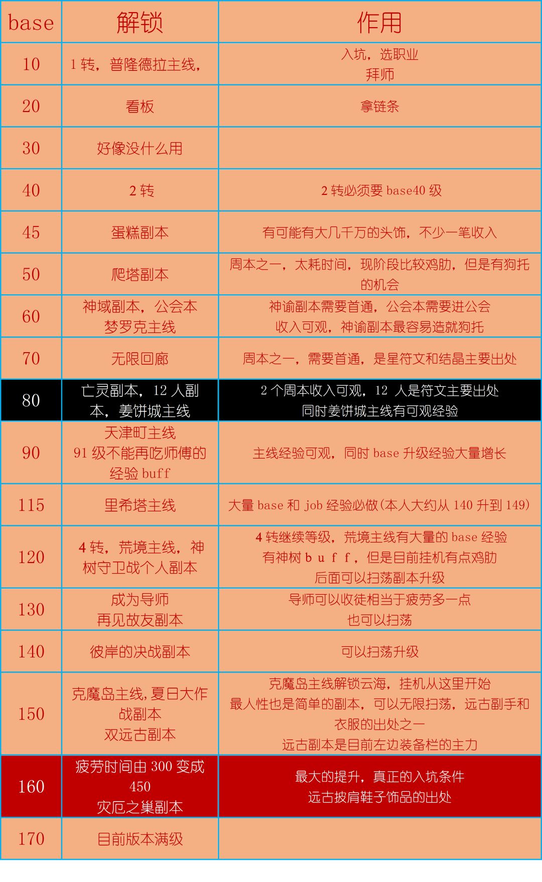 个人认为比较重要的等级是80级,130级,150级和160级(最重要)。80级是可以打除了远古副本的另外所有周本的等级,130级收徒,150可以打远古副本(目前主流装备的产出地,不知道以后影子系统怎样),160级增加150疲劳。 ps:本人只写了一点,像100级解锁某主线任务都没写,如果还有比较重要的请大家补充。图片里面的主线任务(到里希塔)都需要完成上一个主线任务。 考虑到挂机收益和难度,请策划