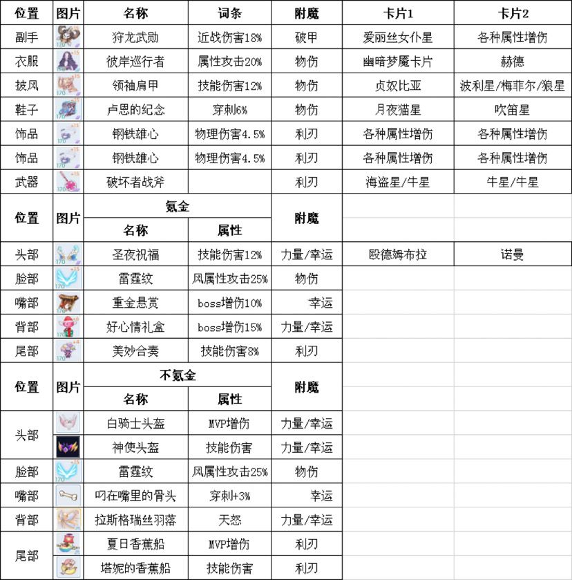 一、装备、卡片、附魔搭配 1、装备对比: 左边的装备没有问题,这里主要对比下嘴部跟尾巴的选择: (1)首先是对比嘴部,选择技伤还是boss增伤 轻食主义 重金悬赏 (2)然后对比尾部,选择技伤还是boss增伤 摇滚迷兔 美妙合奏 (3)有朋友提到伤害套跟cd套的对比,这里也做了测试,木桩一分钟 伤害套 cd套 然后大静牧师帮忙给牺牲再测试,结论还是伤害套高 再者实战中,经常会有跑动,不一定会有每