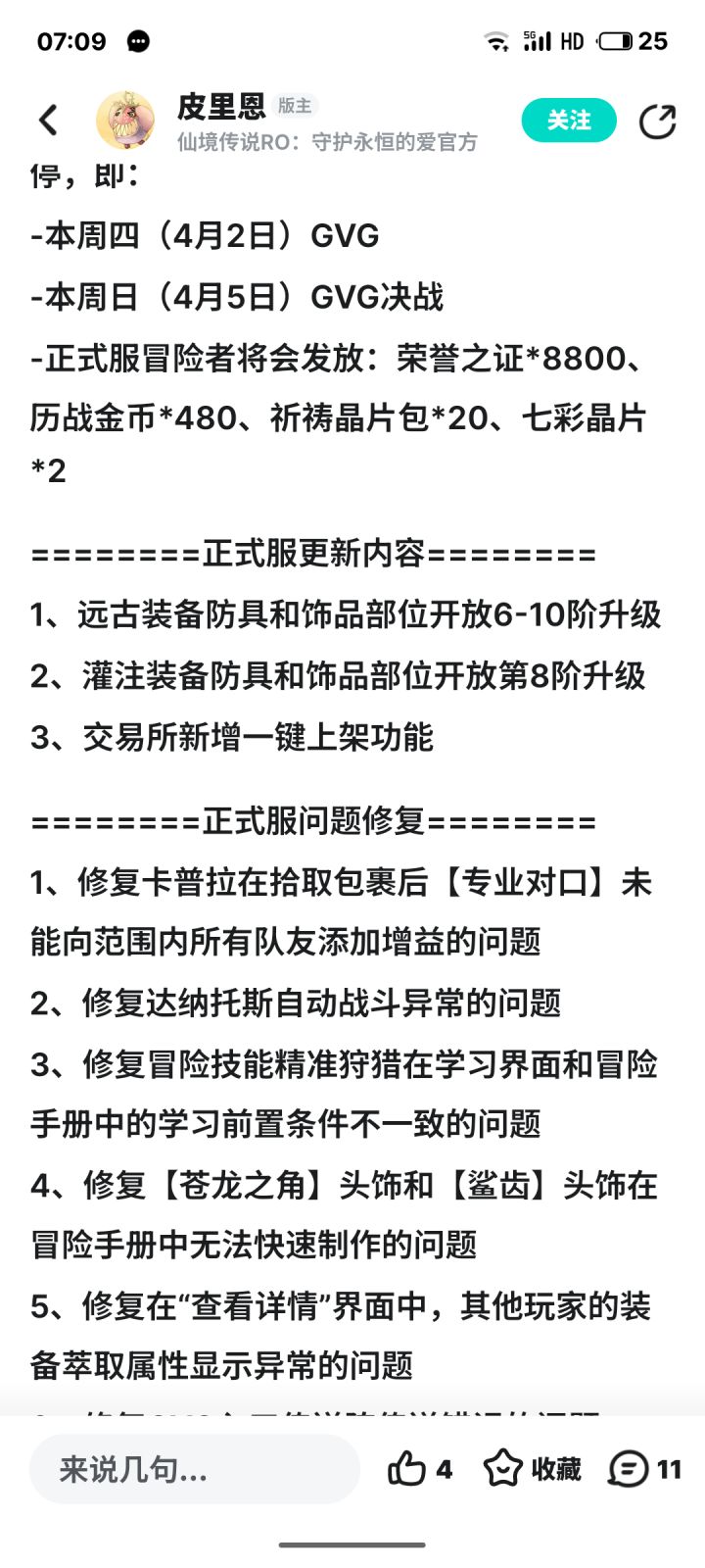 亲爱的冒险者, 我们将于4月1日7点-11点进行一次停服维护,此次维护将更新部分游戏内容并优化服务器配置。维护期间无法进入游戏,敬请谅解。 维护结束后,我们将向【1-6服】的冒险者发放5个「冒险家硬币」、3个「暖心料理」和3个「坠星陨铁」作为维护福利,向【初心】的冒险者发放10个「冒险进阶宝箱」作为维护福利。此次更新详细内容如下:========以下为正式服更新=============