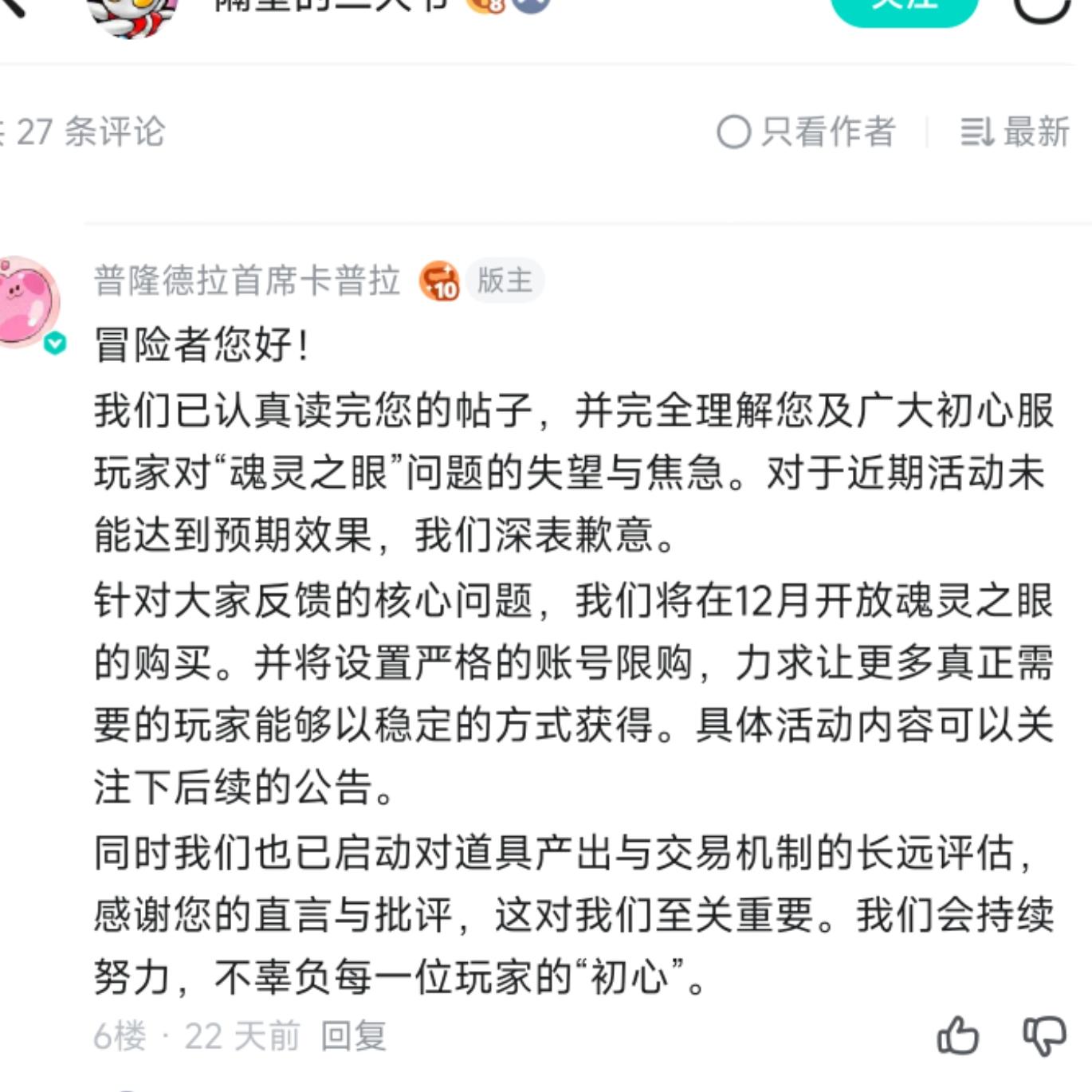 小号抢魂灵无非就是遏他人发展,希望官方多出馈赠活动,让大家拓宽获取渠道,让每个想提升的人有渠道提升,这价格也是相对合理的,想要提前享受这些,我感觉价格贵一点,确实可以,除了这个,能不能出点相对便宜的追赶礼包,例如半价金币、记忆结晶,这类材料,让我们后面玩的追赶一些进度,前面出过追赶礼包可惜只有一期。希望策划大大一期追赶礼包,一期魂灵礼包交叉替换。让大佬能获取魂灵,新人能追赶一些老道具进度。