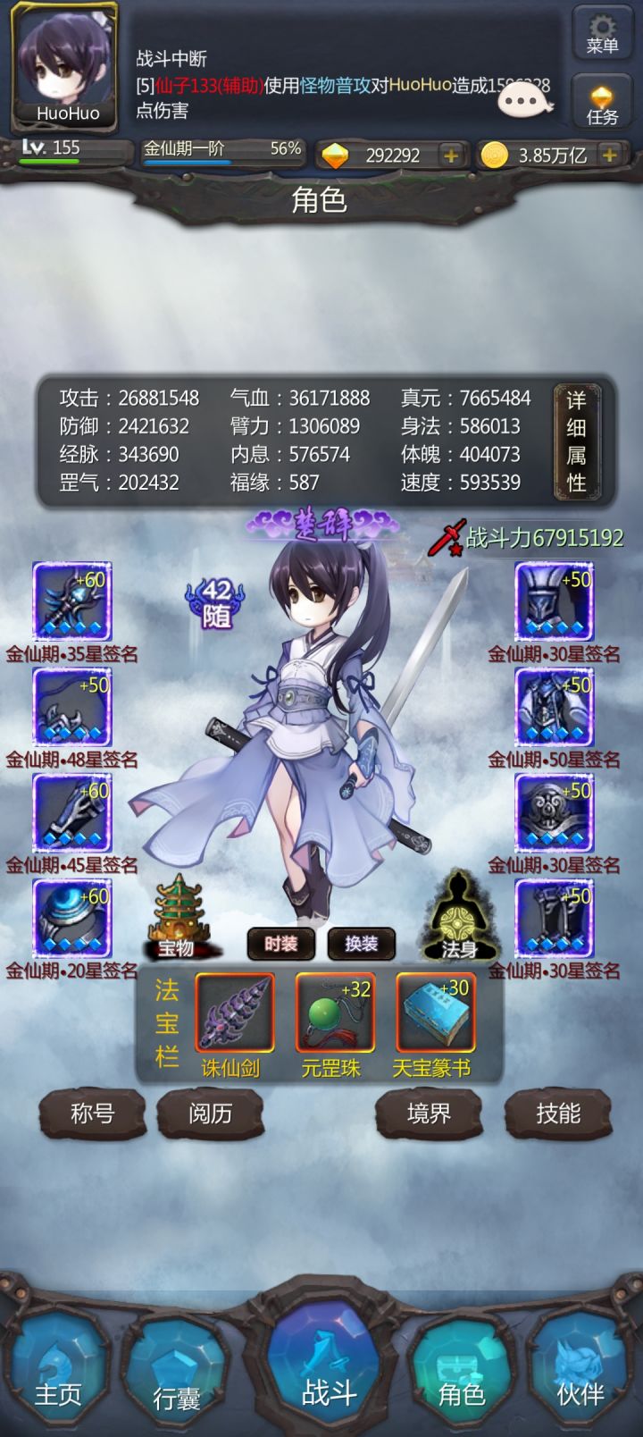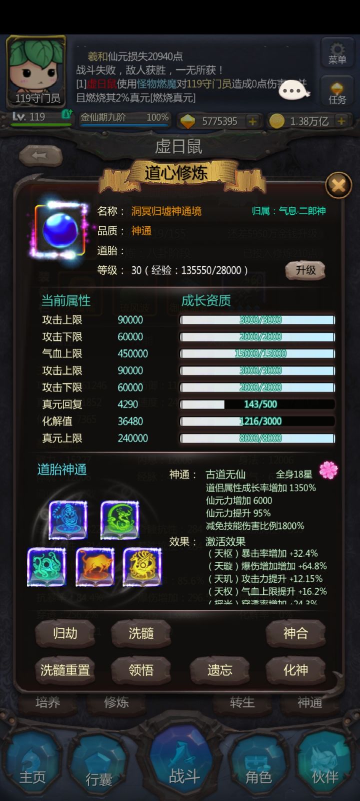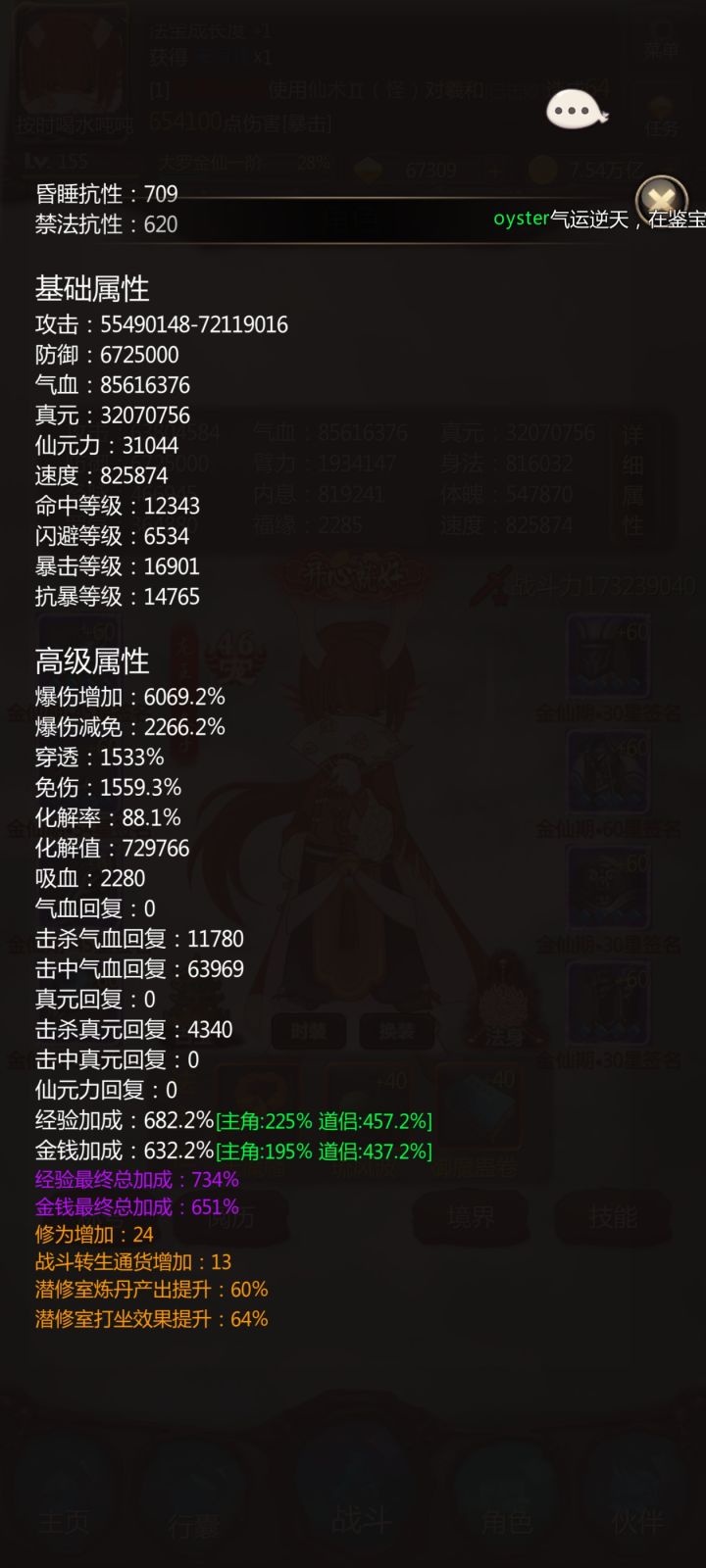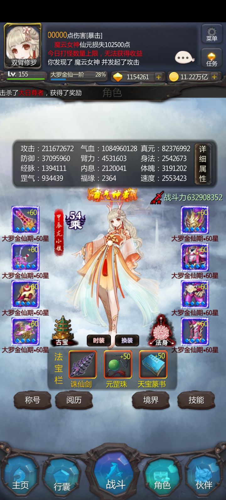 金丹119的号复制到了行者,女神拉满,金法16,全身强化60,签名缺经验,道侣23位奇术也缺经验,所以没搞,女神神通除了等级,其他的与金丹区的号差别不大,后面会发金丹区的详细属性图做对比,2-6楼是行者区详细截图,金丹目前法13金15,7-12楼是金丹截图