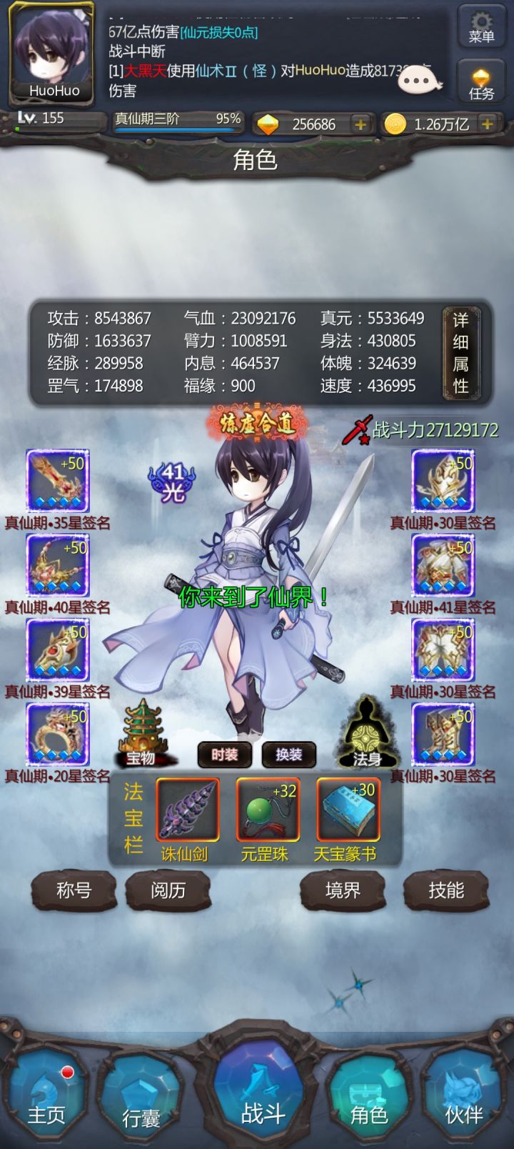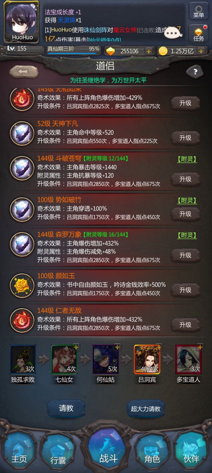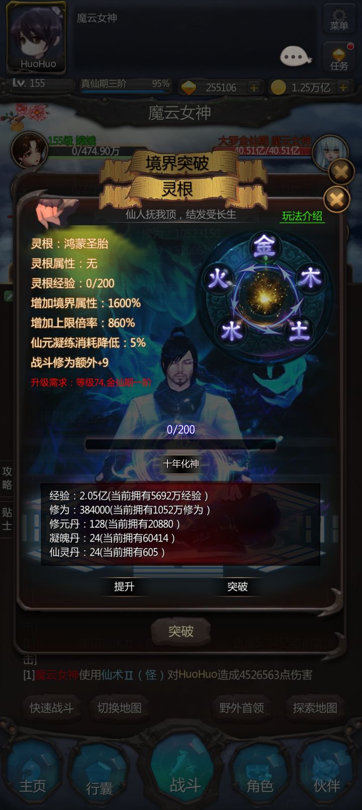 百万臂力、鸿蒙道胎、奇术100、攻击力500w,、凡间500层都完成了。就差万仙400层便可以结束挑战了