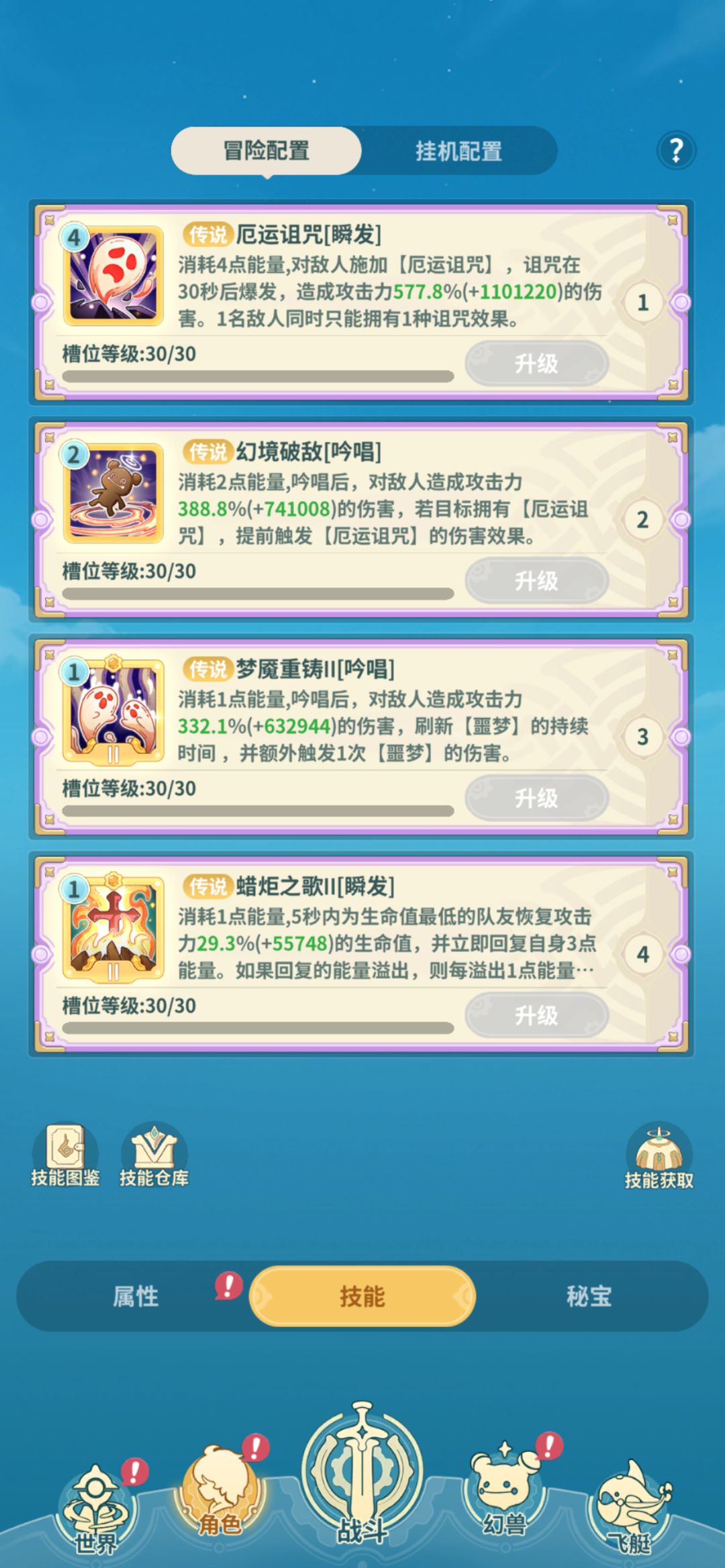 本人没参与过内测,以下内容仅代表自己看法,有相关建议可在评论区讨论 第二天的极限是32级 本人比较菜,之升到了30 还是老样子,屯10个箱子,30级一起开 技能搭配 30级解锁第四个技能,建议选择静心一击,消耗少,单体伤害高,还能减少下一个技能蓄力时常 技能较于昨天,发现随风之矢伤害更客观,换掉了锋锐之矢 新开功能 幻兽寻宝:派遣幻兽出去帮自己巡物资,建议不是紫色的都刷新下,氪金少建议选择宝石 P