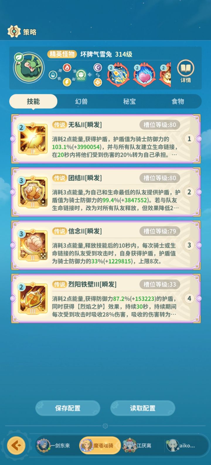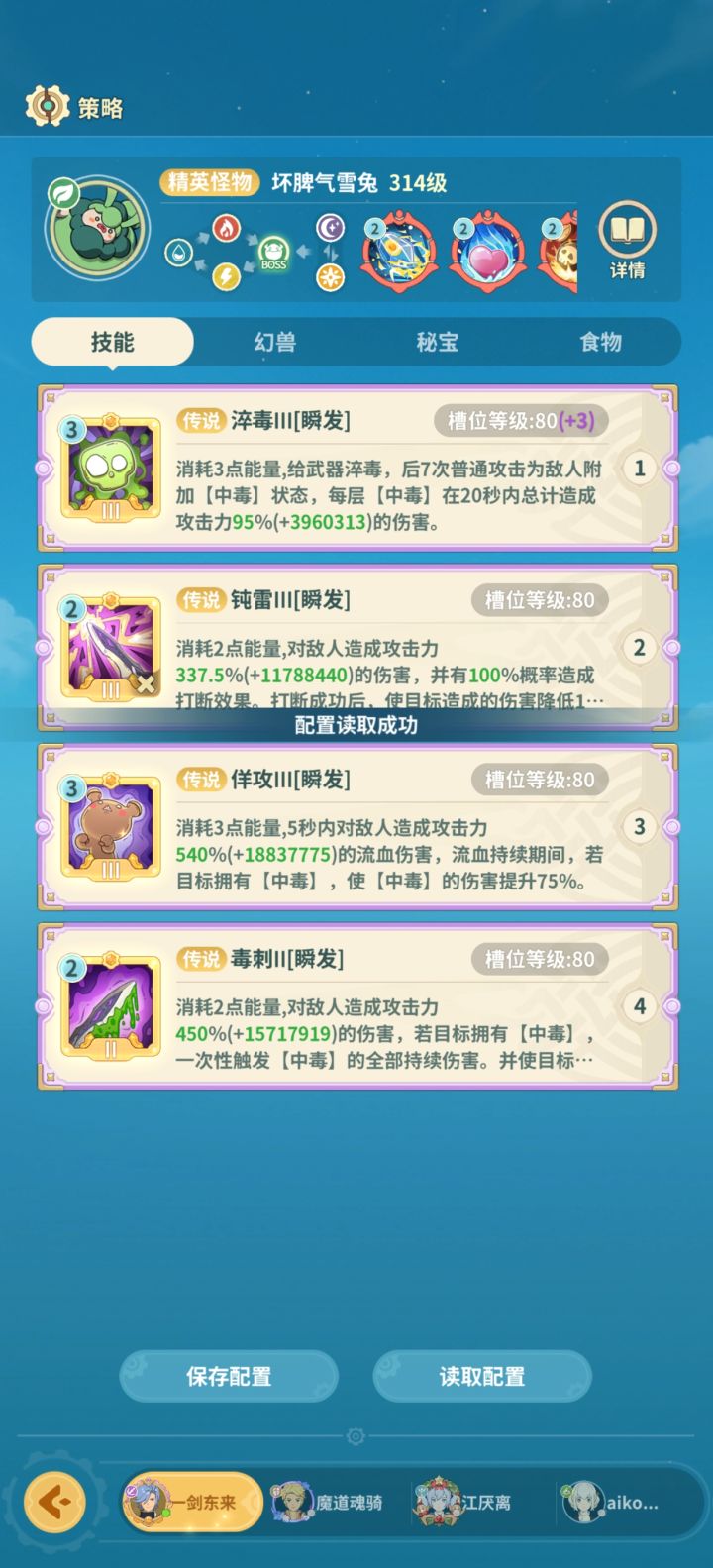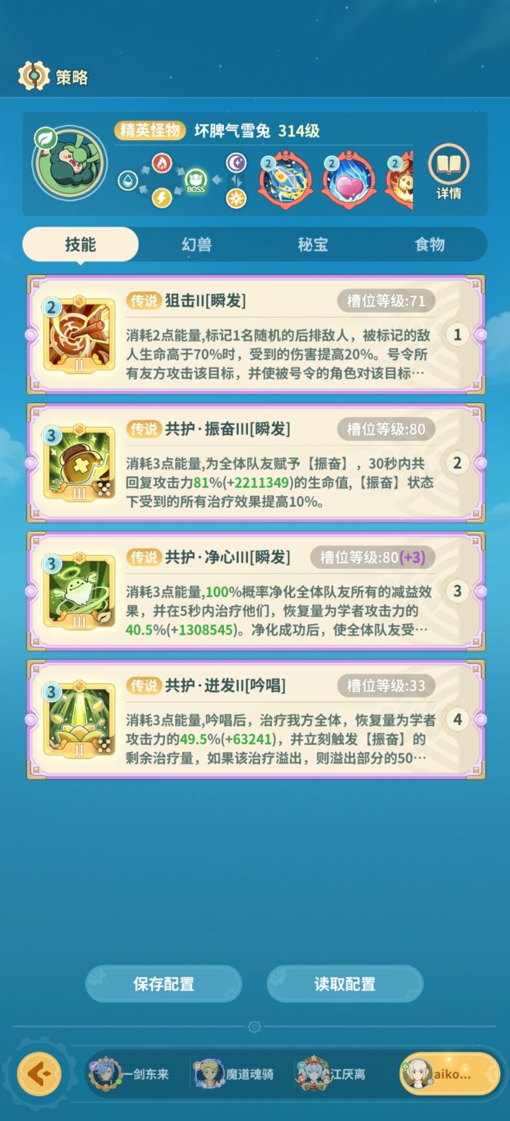 从阿卡塔绿洲开始 记录一下自己队的技能队伍配置: 骑 巫 法 学越级:正常越3 极限越4想来抄作业 没找到 自己做一份记录从150才开始 前面稀有boss没记*肯定不是唯一解,只是正好我们用这套过了#云海之下组队冲榜 图1-4 快拳乌比(小怪)图5-8 诅咒姆拉比(160稀有)图9-12 巨嘴乌鸦图13-16 火爆阿力