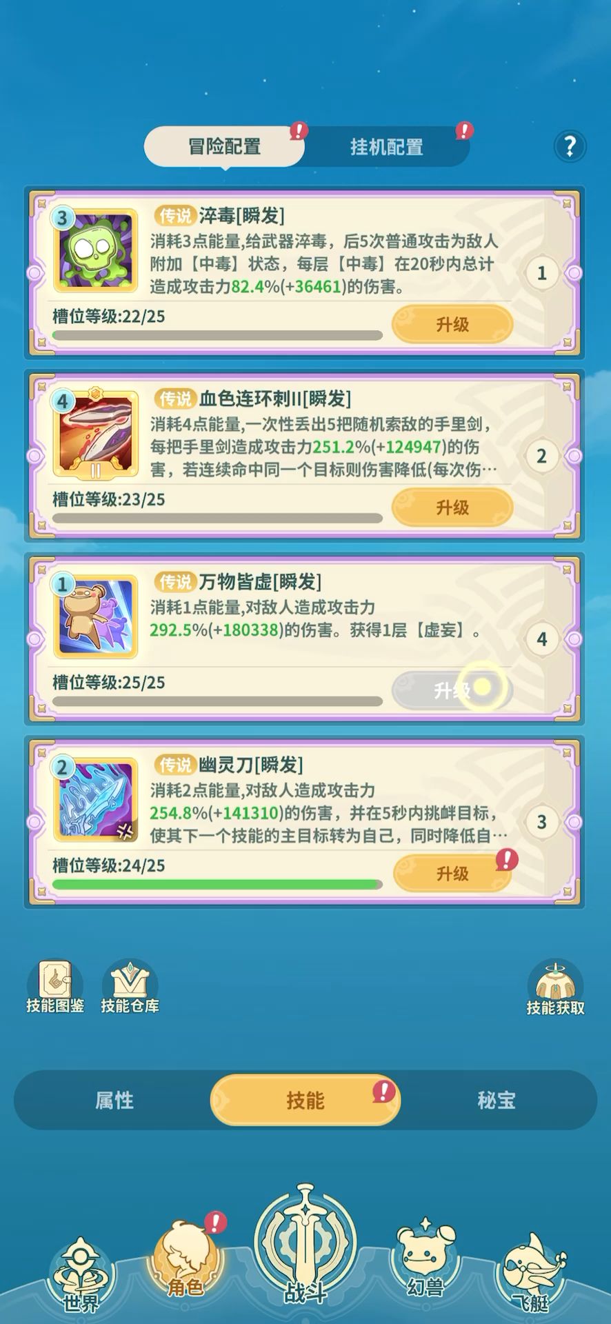 虽说目前没法觉醒的技能没用 但不代表以后没有吧?! 给个全选的选项竟是优先选金色技能喂养,这是多恶心的设定?那怕差一点经验也给你喂了金色技能先,策划真牛逼!!