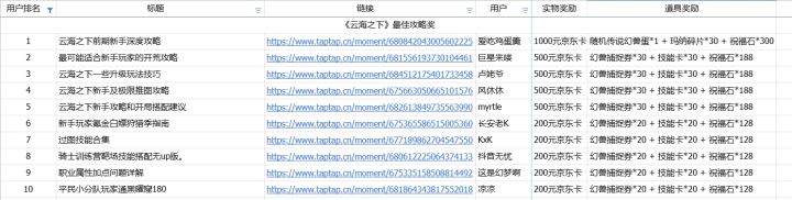 各位冒险者们,久等了!自《云海之下》首月UGC创作大赛启航以来,我们被淹没在无数令人惊叹的作品海洋中!大家的每一份投稿都闪耀着独一无二的光芒!✨经过评审团队公平、认真的评选,首月UGC活动的获奖名单现已正式出炉!以单篇投稿的点赞数、评论数、收藏数的总和计算,取最高数据攻略内容计算,多次投稿的冒险者不能重复获奖,致所有参与本次活动的冒险者: 你们的热情与创造力是《云海之下》最宝贵的财富!活