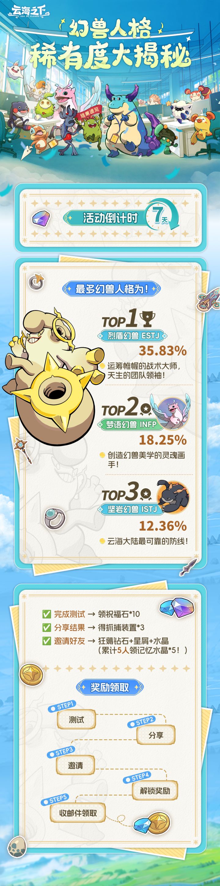 📊【幻兽人格大数据首曝】千人测试结果出炉!当前官服TOP3幻兽人格诞生:🌟 「烈盾幻兽·ESTJ」 —— 35.83%的霸者!运筹帷幄的战术大师,天生的团队领袖!🌙 「梦语幻兽·INFP」 —— 18.25%的浪漫派!创造幻兽美学的灵魂画手!⚔️ 「坚岩幻兽·ISTJ」 —— 12.36%的坚守者!云海大陆最可靠的防线!<<<❗ 稀有人格特质解锁!:「星光幻兽·INFJ」仅占0.17%