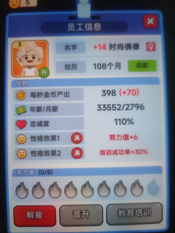 玩了三天,23小时了。在这里给大家掏个攻略出来。首先是关于开局,我们要跳出条条框框。我们的目的是什么?是挣钱!!!所以人才培养啥的就不要了全找一级工就行了,结工资的时候全不结,紫色的人才意义不大,不过可以在没月第四周星期五的时候开了拿紫碎片,游戏缺的是橙碎片和紫晶。这里建议直接拿紫碎片换,蓝的性价比不高,麻烦。橙色人才这边建议拿黄埔江边的金发女。为什么?人家有起步努力+3词条和培训