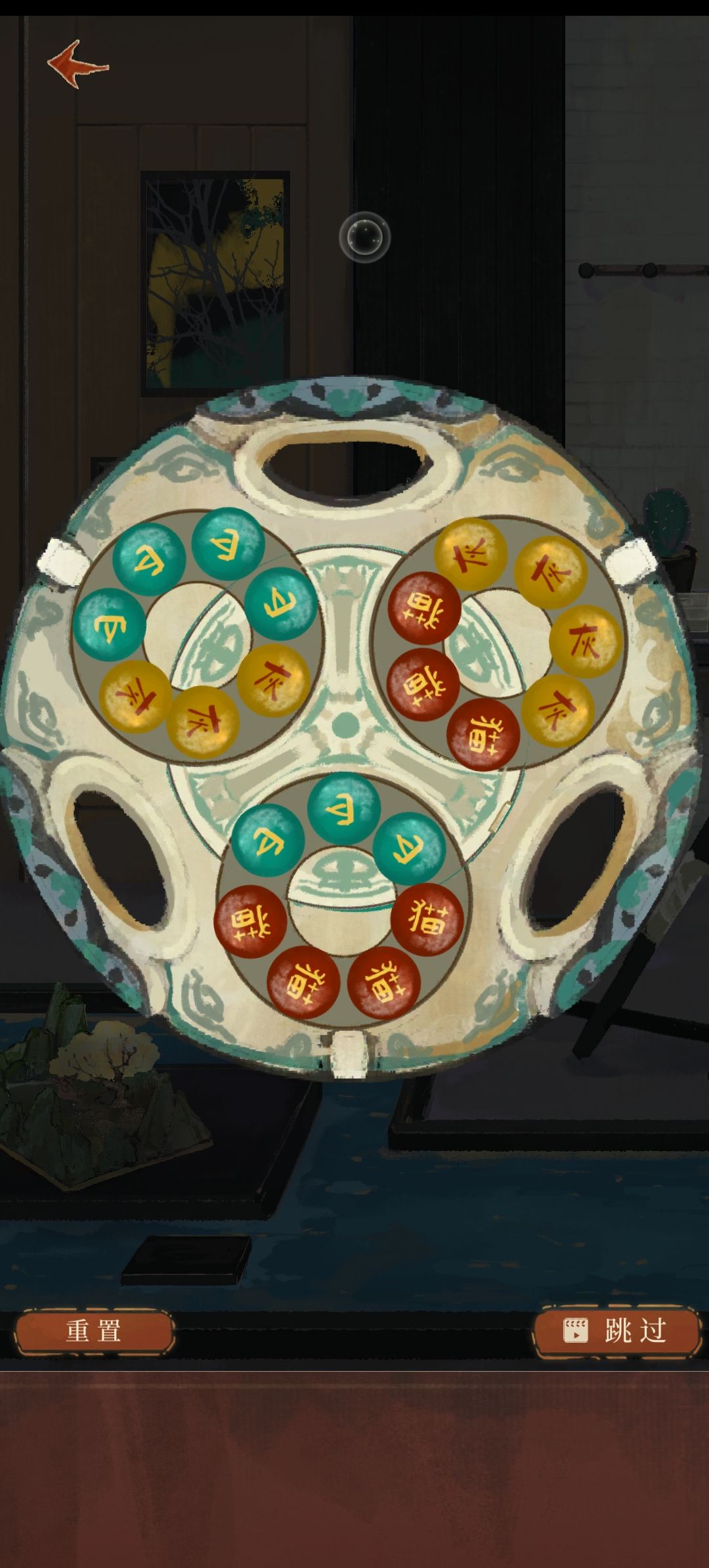 #栖云异梦2瑶山谣 点击棋盘进行对弈 六博棋,点骰子就行了,一直投,将棋子投到中间位置就完成了,总会过去的。此处获得一个琉璃瓶 ①玉钺,上面是⑤鼓的敲击顺序(大黄 小红 小黄 小黑 大绿 小绿 大黑)去鼓那里按上述顺序敲击,回到①拿到玉钺 ②半块蚩尤环 ③笔记本,可拿到5块照片碎片,半块蚩尤环,一页歌谣,和字谜(全部拼接完成后,看红框内容“玉盘全都押高张”即稍后拿到四块玉盘放到棋盘的”高“”张“