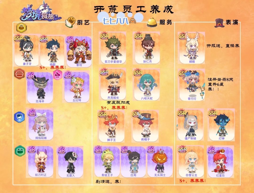 梦境食旅开荒员工怎么养? 1.员工岗位有3种,分别是烹饪、服务、表演。3种职业的员工都需要培养2人。 2.烹饪职业又分中餐,西餐,日式,甜品,饮品五种。 前期开荒主培养中餐和西餐。在游戏第二天订单提交任务时会涉及日料,所以在开启第三张工作台时可以用日料厨师。 3.游戏第一天会送SSR嫦娥,属于表演职业,游戏签到第2天会送青行灯,第8天会升至5星。青行灯也属于表演职业。所以表演先养这2个员工就够了。