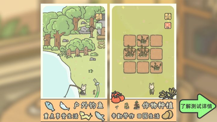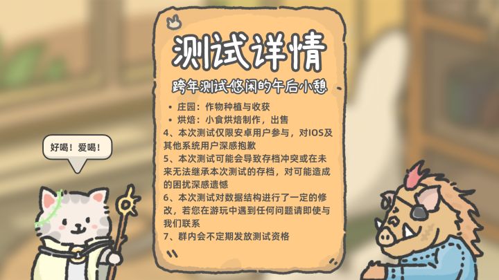 感受,我话多又有些乱。具体玩了11小时,我觉得游戏非常的不错。接下来美美等待解释家具,哈哈。当初觉得和动物餐厅画风很像就很好奇游戏内容,正好在内测,本着批评的态度进来的,发现完全不一样,我也是迷上了。游戏休闲,也适合像我这种想几天又玩一下的人(按当前的测试来看)。加上现在凌晨共三天,嘿嘿我能熟练背出饮料需求了,是个合格咖啡师傅了。兔兔每次钓鱼都表情都好可爱🥰鱼饵和种子每小时整点刷新,种子在商店可