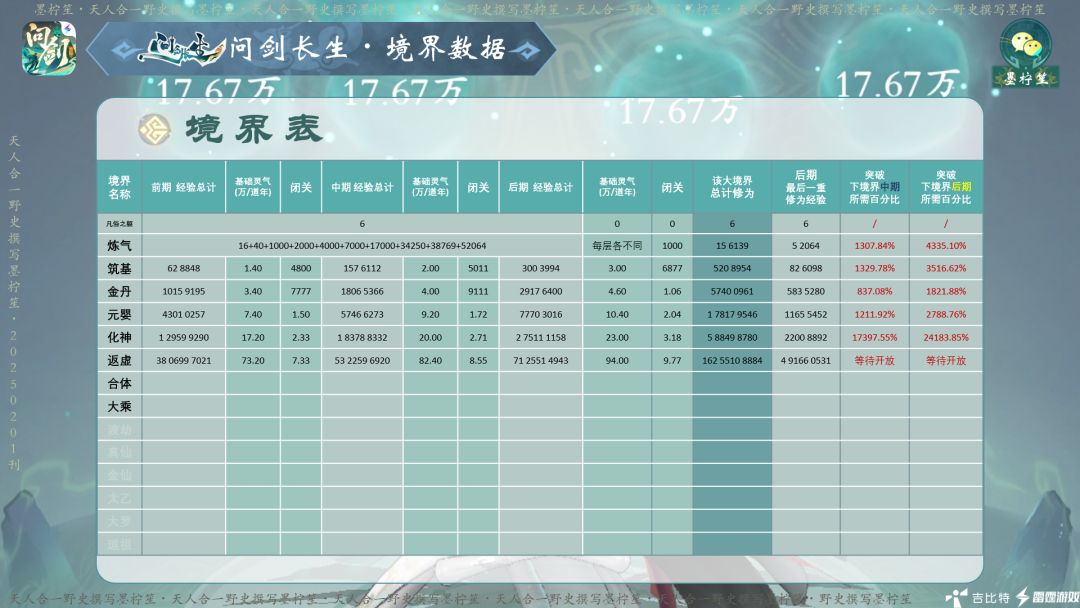 《问剑长生全境界表(返虚版本)》