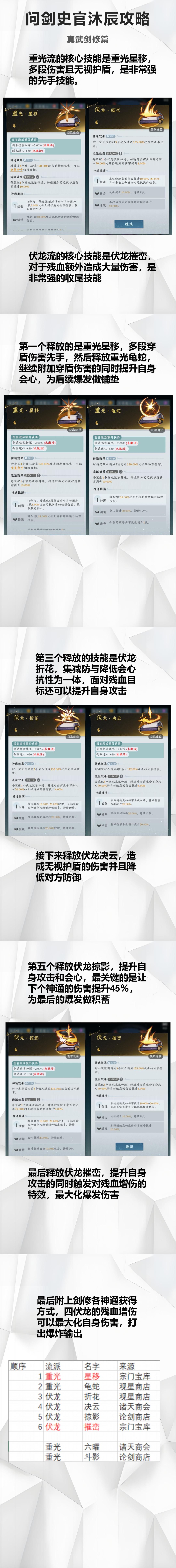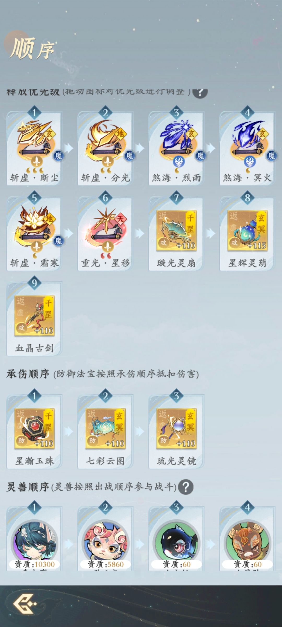 公测刚更新反虚版本时,在这里向各位道友提供了伏龙流派的玩法思路,时隔几个月,也终于要迎来新的版本,在这反虚期尾声的最后阶段,向各位分享一下我的两种伏龙流派用法。 第一个是我的内测号,3个地1斩虚,3个天1伏龙,顺序为分光-断尘-掠影-霜寒-摧峦-诀云-塔-葫芦-剑。法相选择朱雀。依靠掠影简单粗暴的攻击加成buff,用霜寒压血线,从而达到享受伏龙的绝杀词条,第二轮利用斩虚流派的特性在霜寒释放后打出托