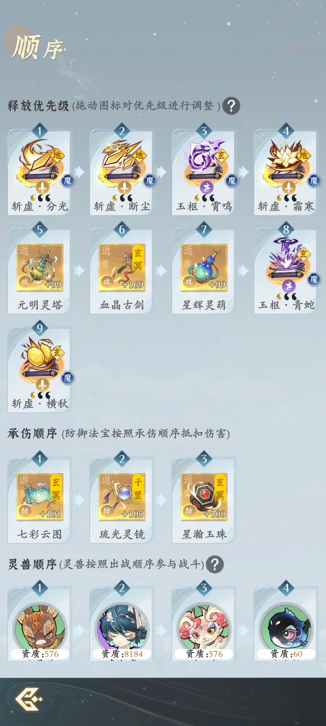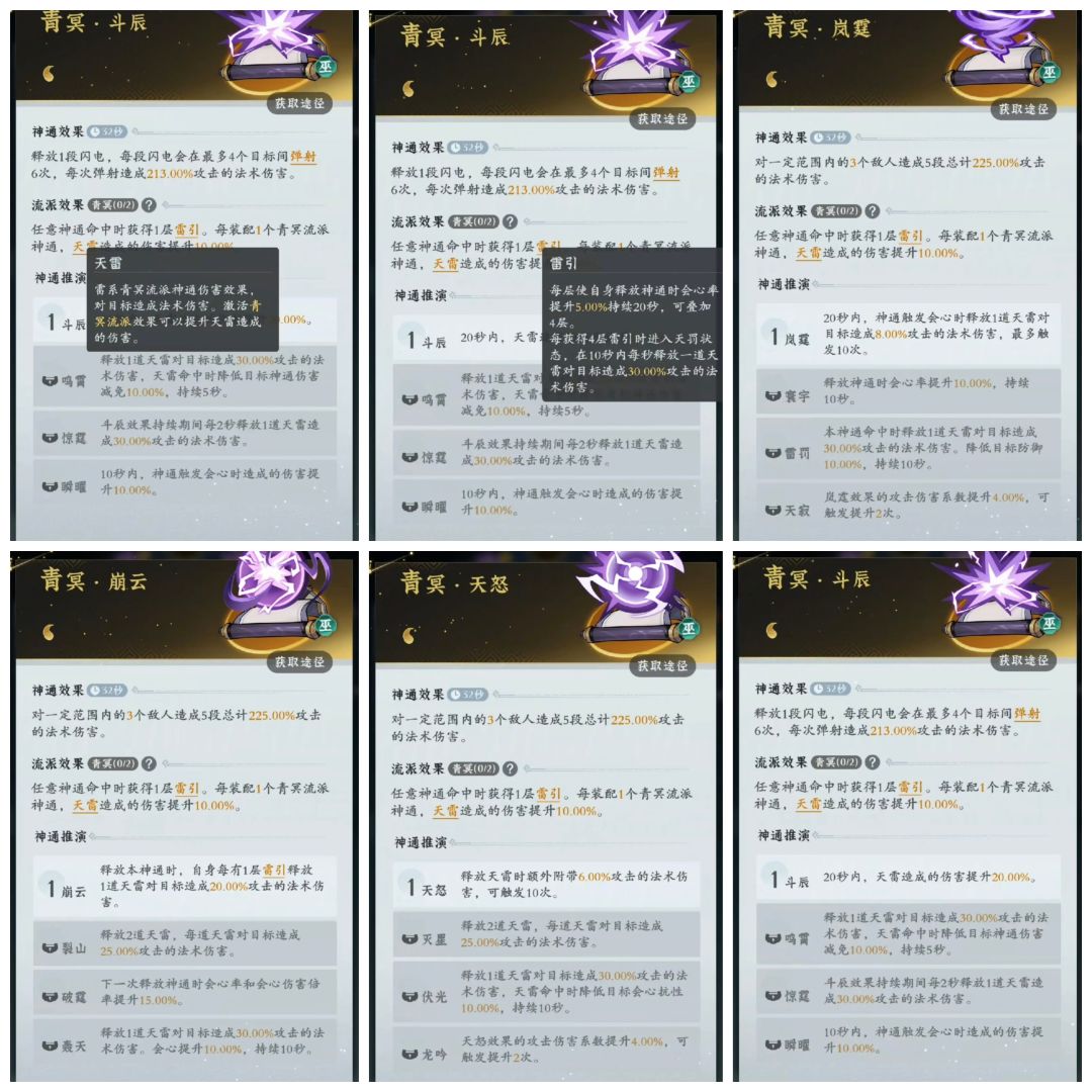 搭配一: 配件-斗辰-岚霆-配件-霄鸣-青蛇(天一) 优点:所需门派贡献少,多余贡献可换蓝紫狗粮,拉其他神通等级;养成难度低 搭配二: 配件-配件-岚霆-崩云(地一)-霄鸣-青蛇(天一) 优点:霄鸣可为副c,崩云到大乘期比斗辰有用 缺点:所需门派贡献多,蓝紫狗粮可能不足 搭配三/废弃版: 配件-配件-岚霆-霄鸣(天一)-崩云(地一)-青蛇(天一) 优点:霄鸣、崩云皆可为副c 缺点:所需门派贡献多;
