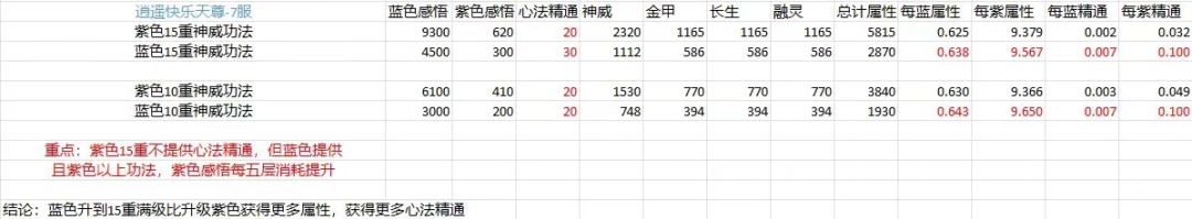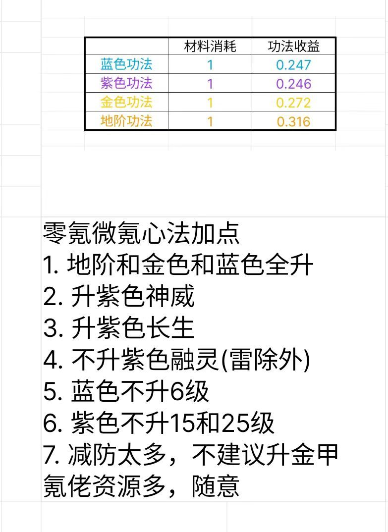道友请留步,我是温柔: 接下来给大家带来心法篇如何受益最大? 众所周知,心法分为:神威,长生,金甲,融灵 其中神威收益最大,长生其次,金价和融灵收益都不是很大,那么我们该如何去推演和修行心法? -- 因为平民玩家修行推演资源非常有限,所以怎样把资源提升战力最大化很关键!!! 推演修行顺序: 地级心法>橙色心法>蓝色心法>紫色心法 看下图:图总结了每一点消耗而获得的功法收益,由此可知紫色的收益是最差