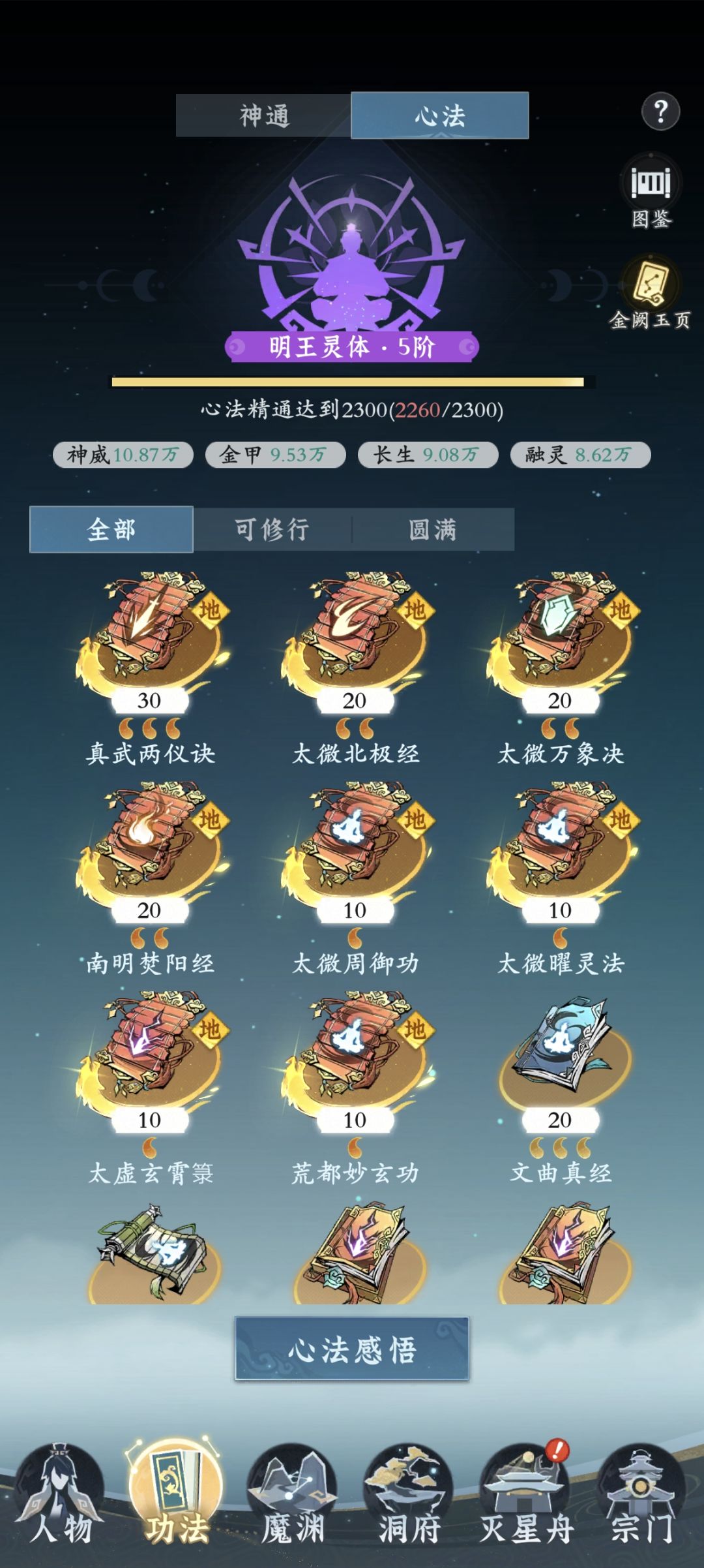 大家好,我是呱呱,本期为大家带来心法升级攻略。 心法为我们提供大量四维属性,此乃越战的根本。 在此,为大家带来最高性价比升取心法的方式。 一、心法有神威、金甲、长生、融灵四大方面,其中神威最重要,其次是长生。 二、在心法获取增益的性价比上,分别是地阶、橙色、蓝色、紫色。其中紫色最不划算。 三、升级心法,优先升级地阶心法和橙色心法,直接拉满。 四、其次是蓝色心法,每升级5重,会为我们提供心法精通,可