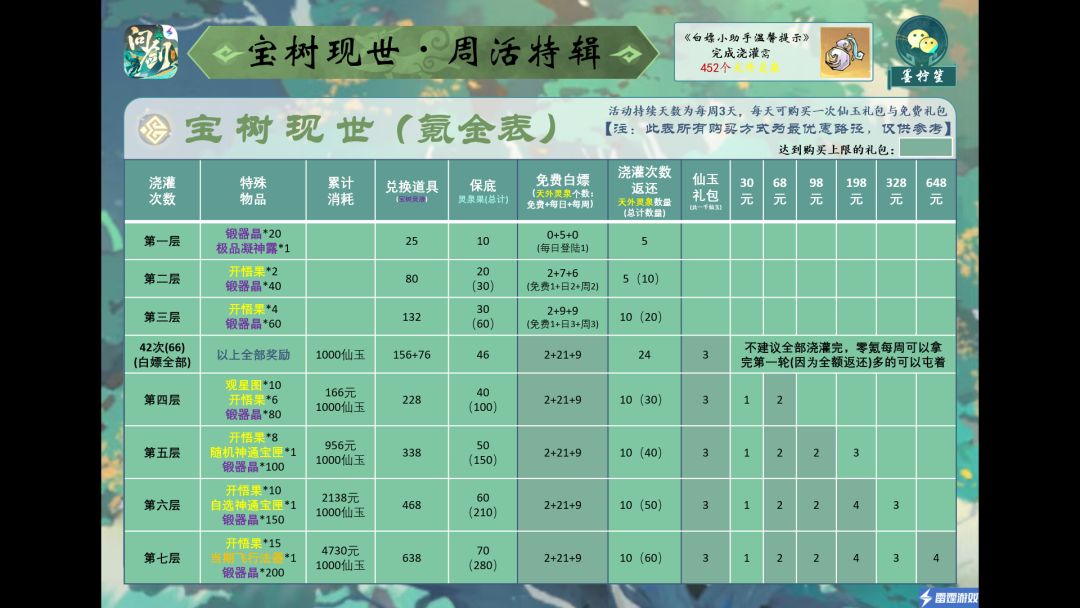 《问剑长生周活氪金攻略表三大活动合集》