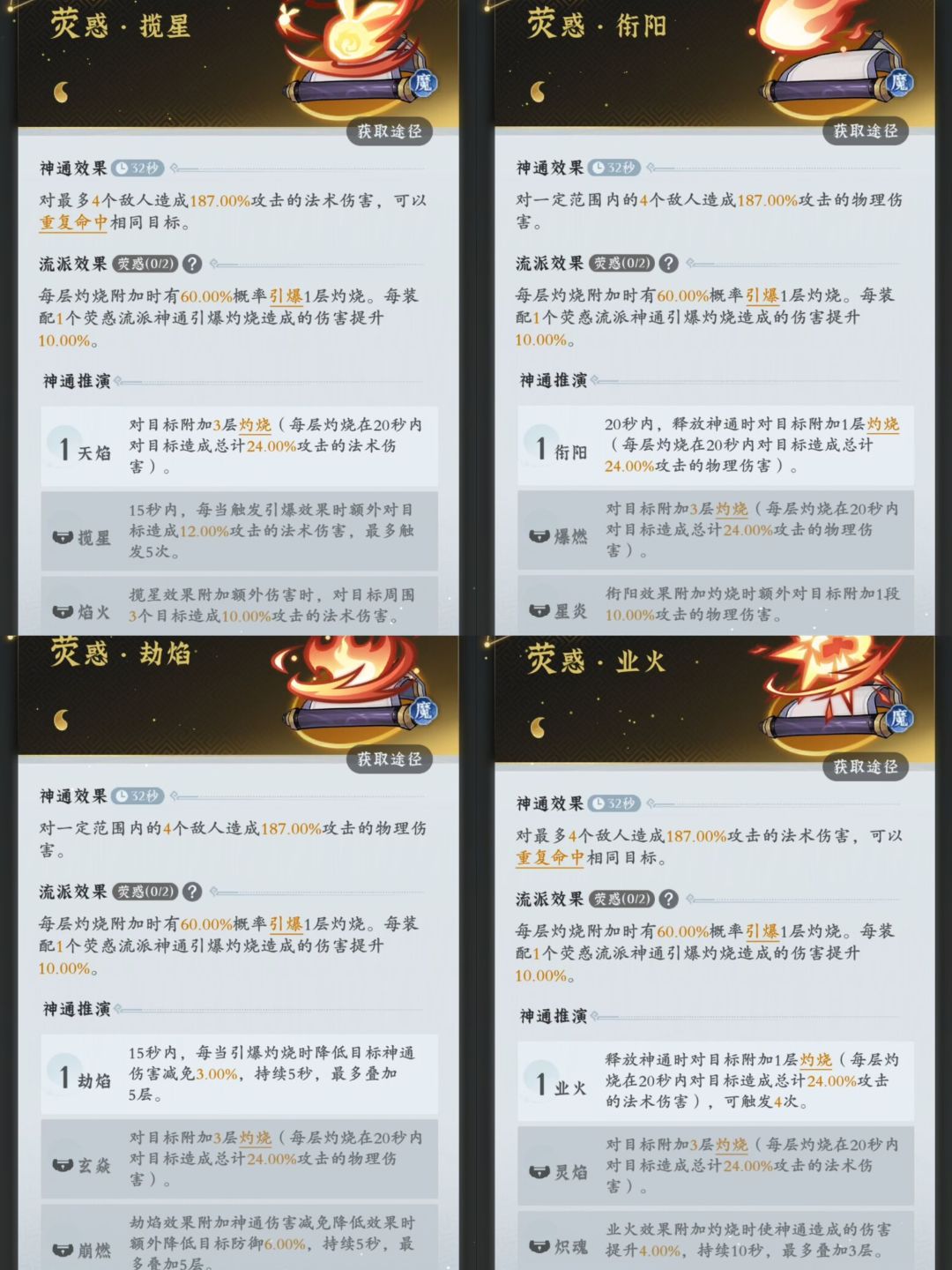 提供一套火修思路,仅供参考: 拦星 冥火 业火 截焰 裂天 三昧(灵界萤惑神通均为玄起步) 灼烧:拦星3+6 截焰:3 业火:4+3 19*40% ~七层灼烧,足够三昧吃满 灵界的火修主要出伤神通衔阳面板词条的属性和三昧比还是差了一些的。#问剑长生