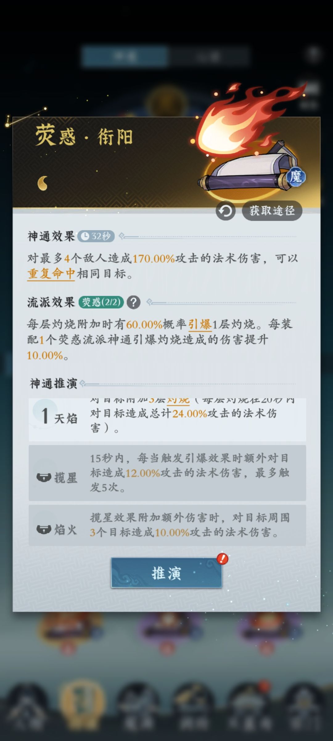 提供一套火修思路,仅供参考: 拦星 冥火 业火 截焰 裂天 三昧(灵界萤惑神通均为玄起步) 灼烧:拦星3+6 截焰:3 业火:4+3 19*40% ~七层灼烧,足够三昧吃满 灵界的火修主要出伤神通衔阳面板词条的属性和三昧比还是差了一些的。#问剑长生