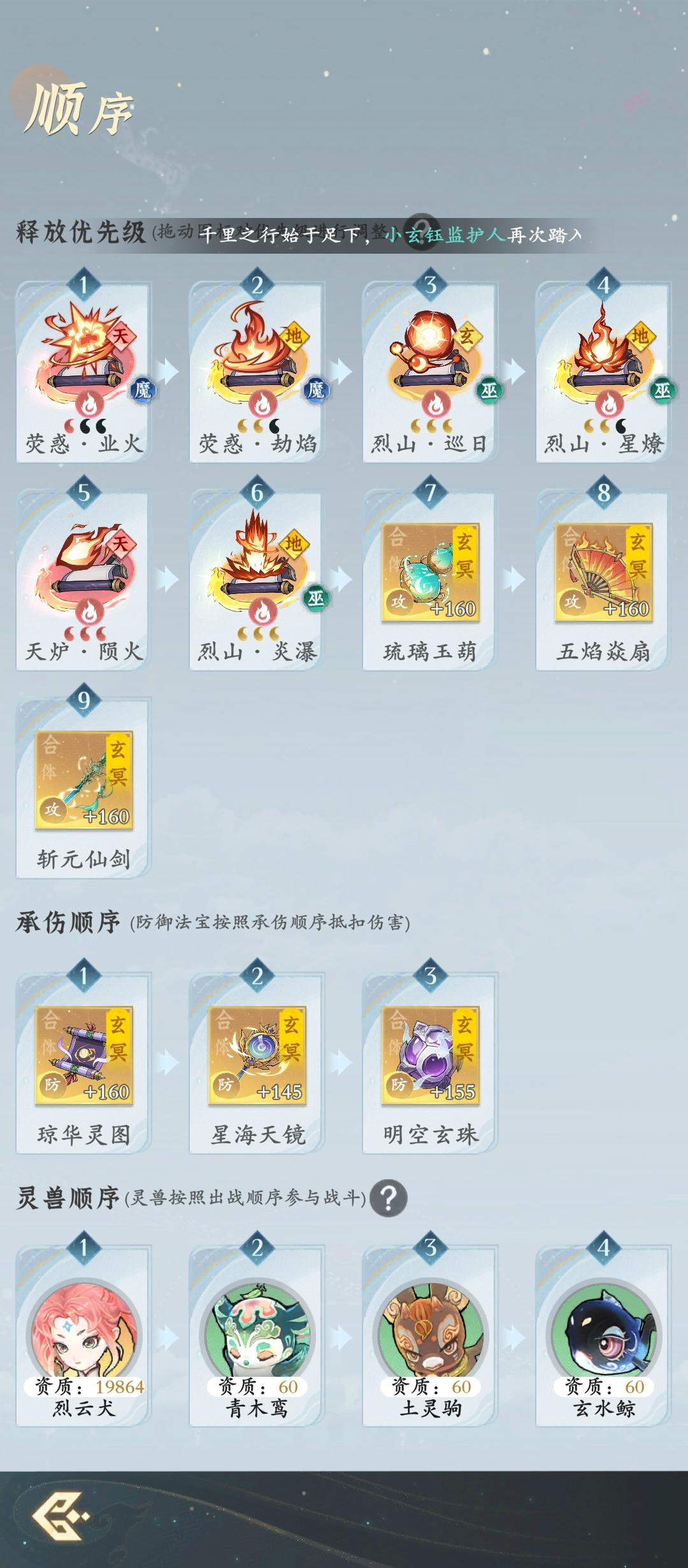 #问剑长生攻略 拖了好几天的攻略现在才发(懒),不过也完善了搭配的思路和想法,, 那么废话不多说,直接开始本期的讲解 荧惑作为灵界的火系神通,它的伤害数据是非常不错的,这里我想了两套搭配,一套是4火2剑的延续,另一套则是6火的可能性,, 注:素材由青玄子所提供 第一套: 4荧惑+分光+断尘 ps:这是我拿到图片一开始所想的体系,延续了4火2剑的思路,不过后面拿到了2斩虚的切磋图后发现白板斩虚打出
