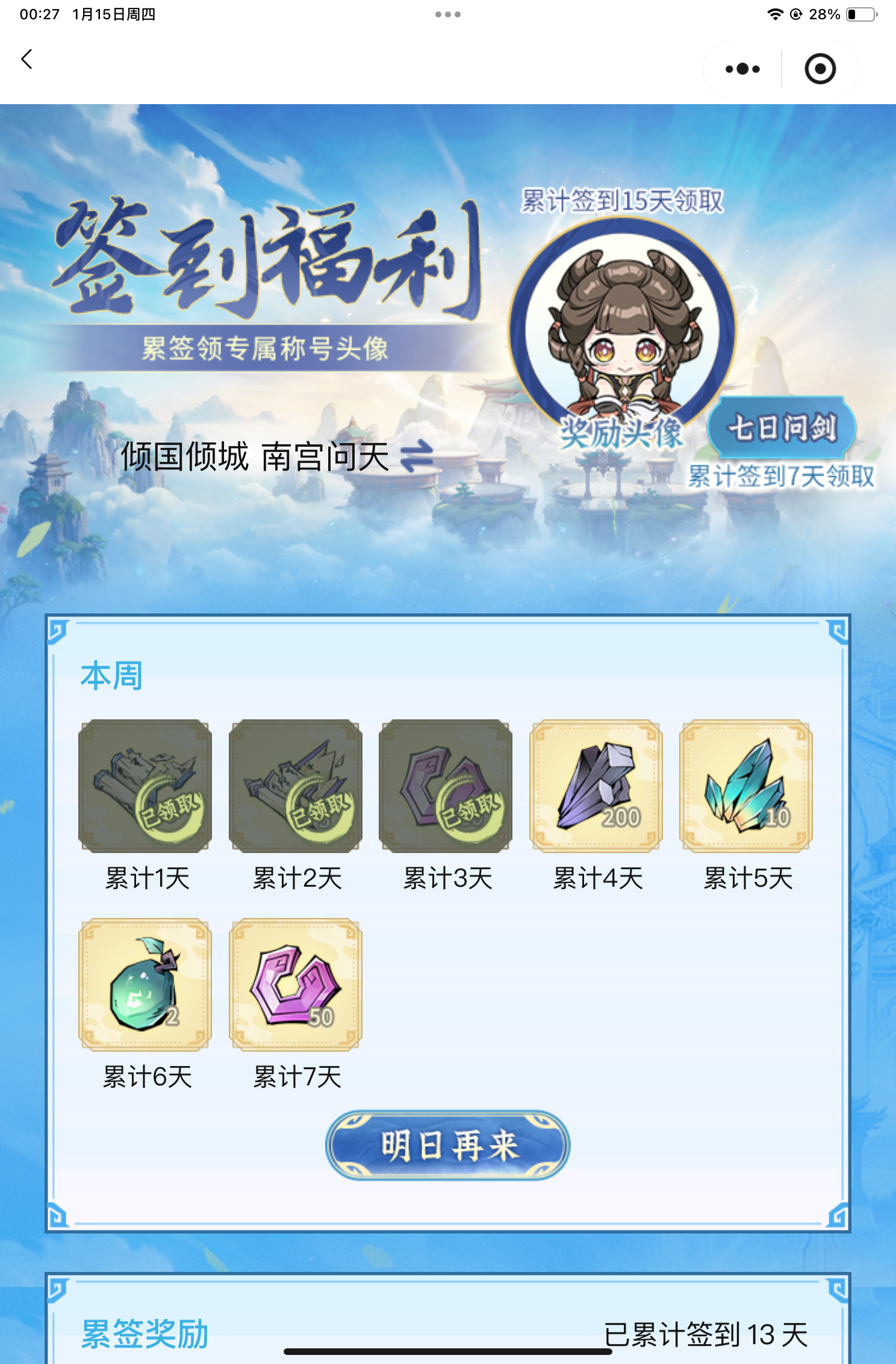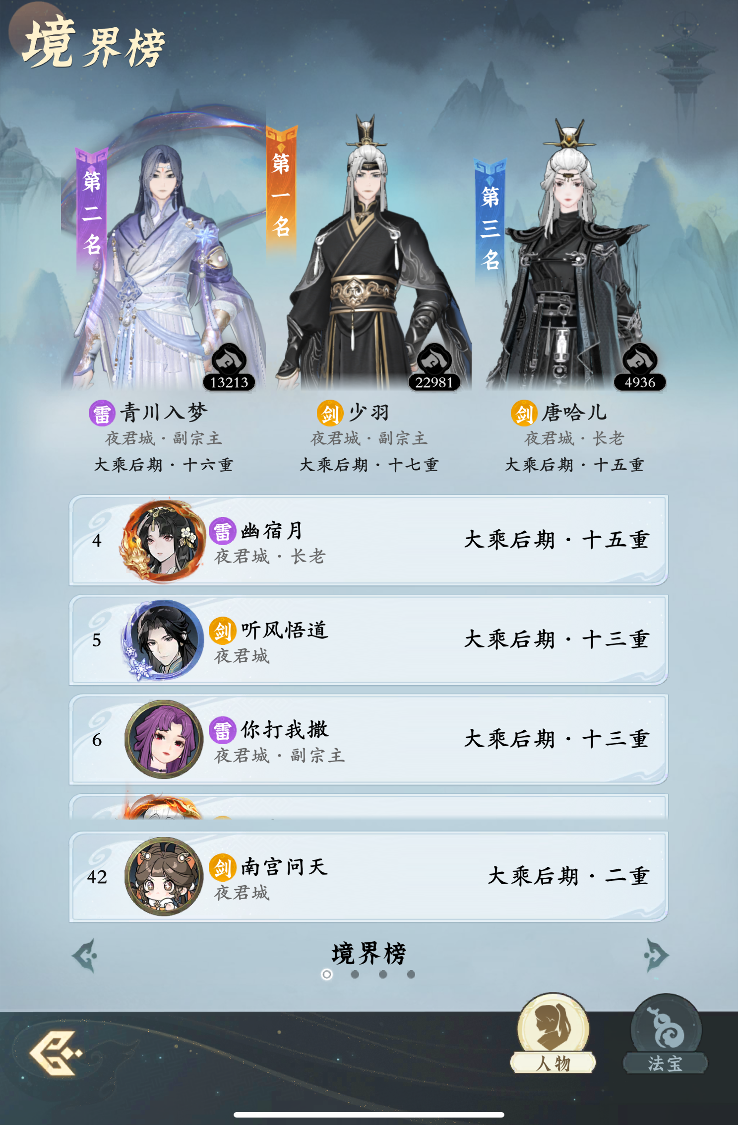 #问剑长生 时间:1月15日0点修为来到大乘后期2重37%,境界排名42,战力1863亿,玉元2.68万,签到第13天