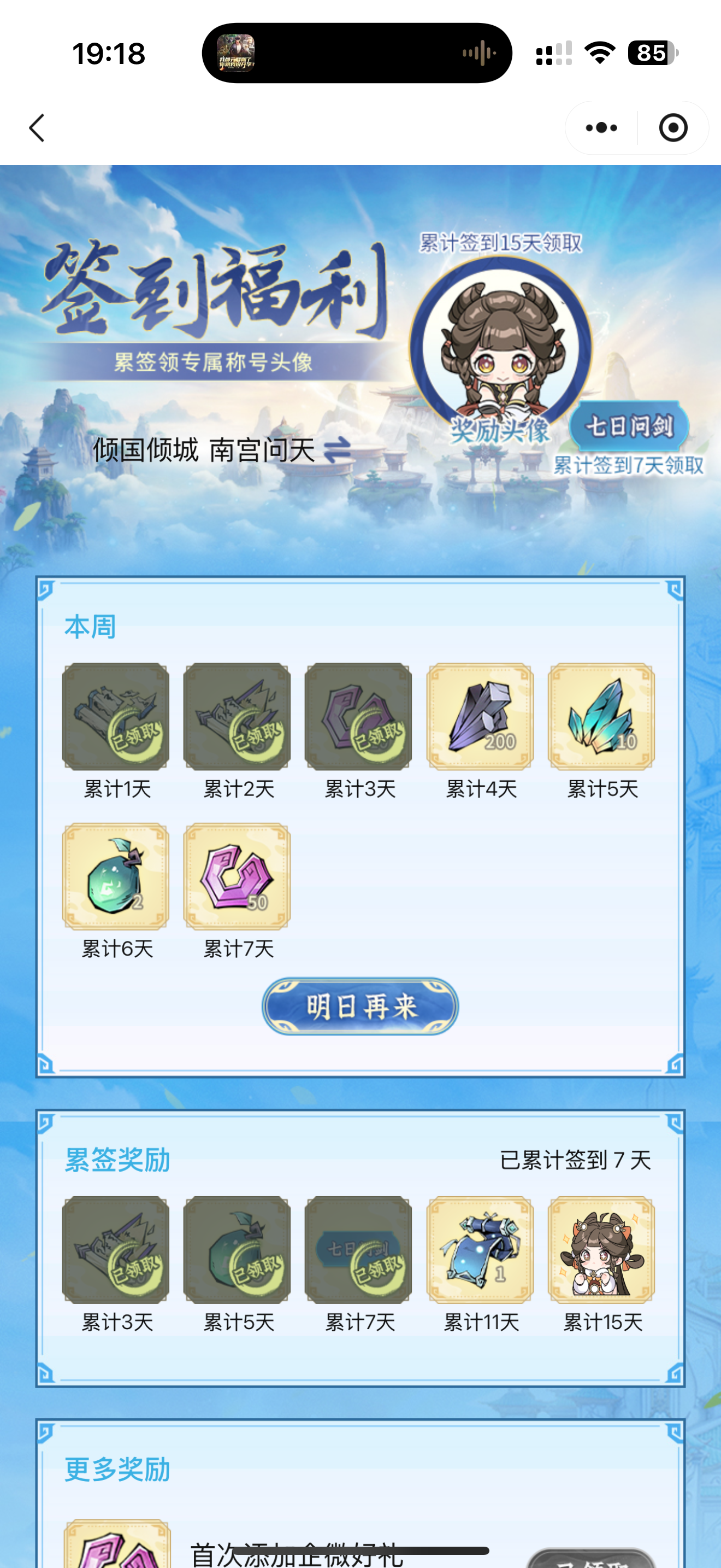 #问剑长生 时间:1月7日晚上19点修为来到大乘中期19重54%,境界排名42,战力1434亿,玉元2.86万,签到第7天