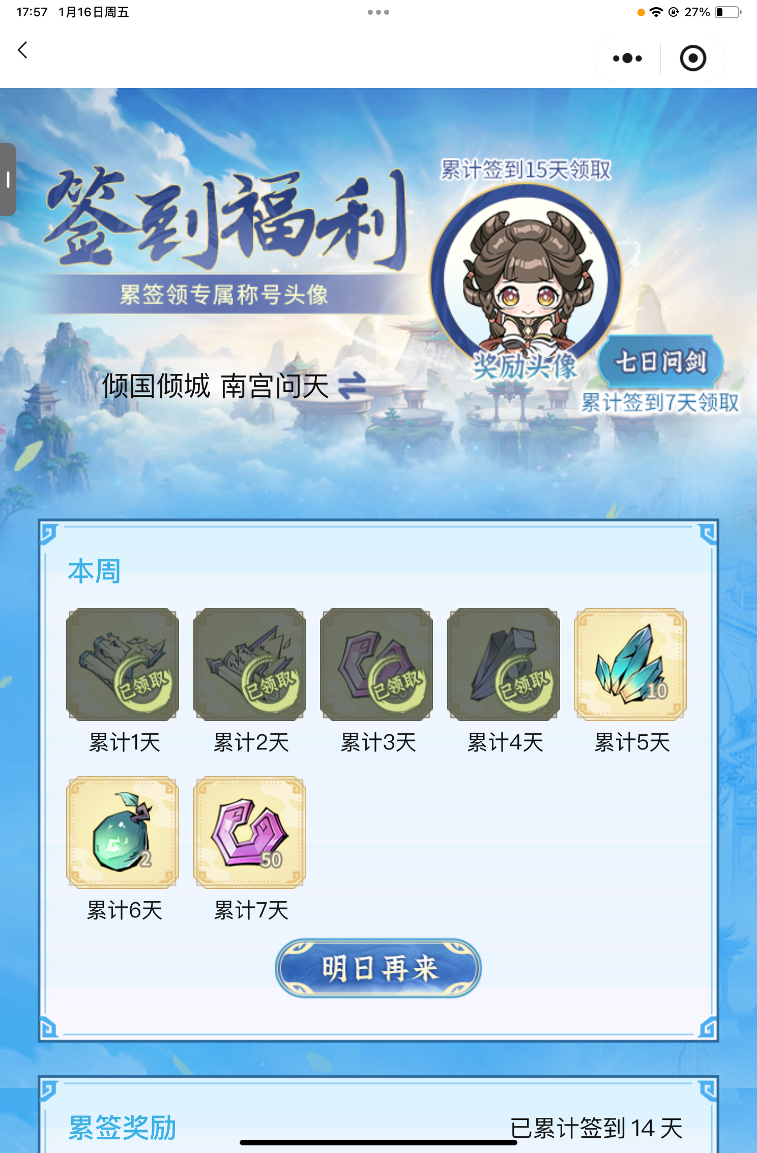 #问剑长生 时间:1月16日17点修为来到大乘后期3重36%,境界排名42,战力1880亿,玉元1.83万,签到第14天