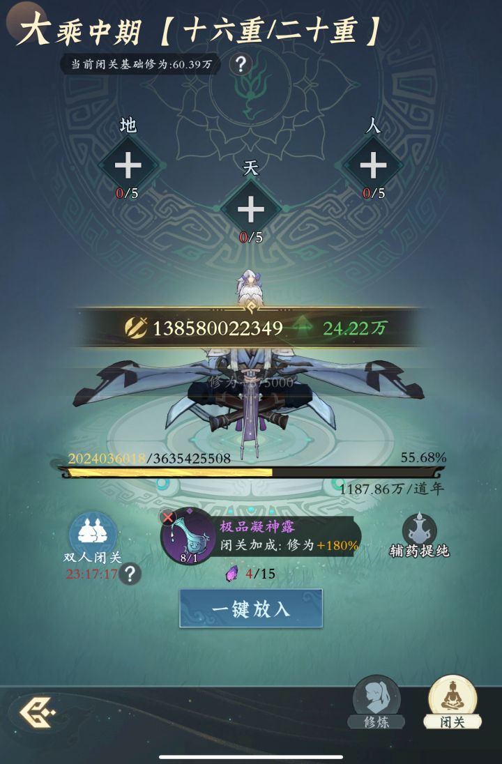 #问剑长生 记录时间:12月29日晚上18点修为来到大乘中期16重55%,境界排名41,战力1385亿,玉元2.58万,签到第26天