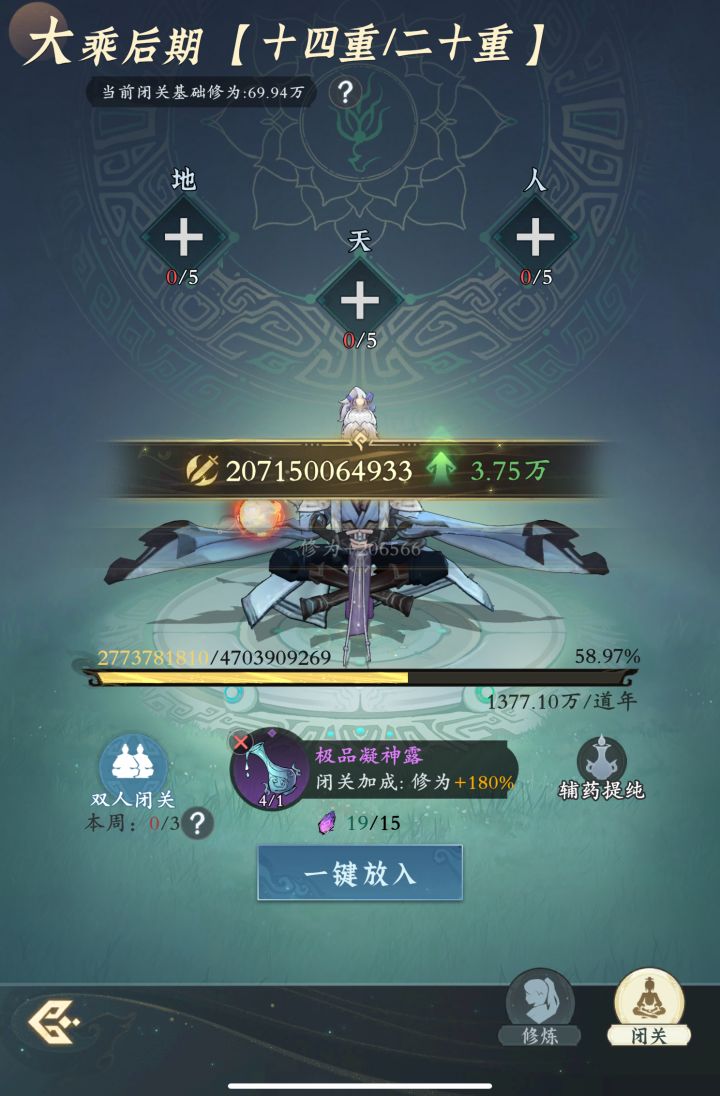#问剑长生 时间:2月16日2点修为来到大乘后期14重58%,境界排名41,战力2071亿,玉元2.98万,签到第12天