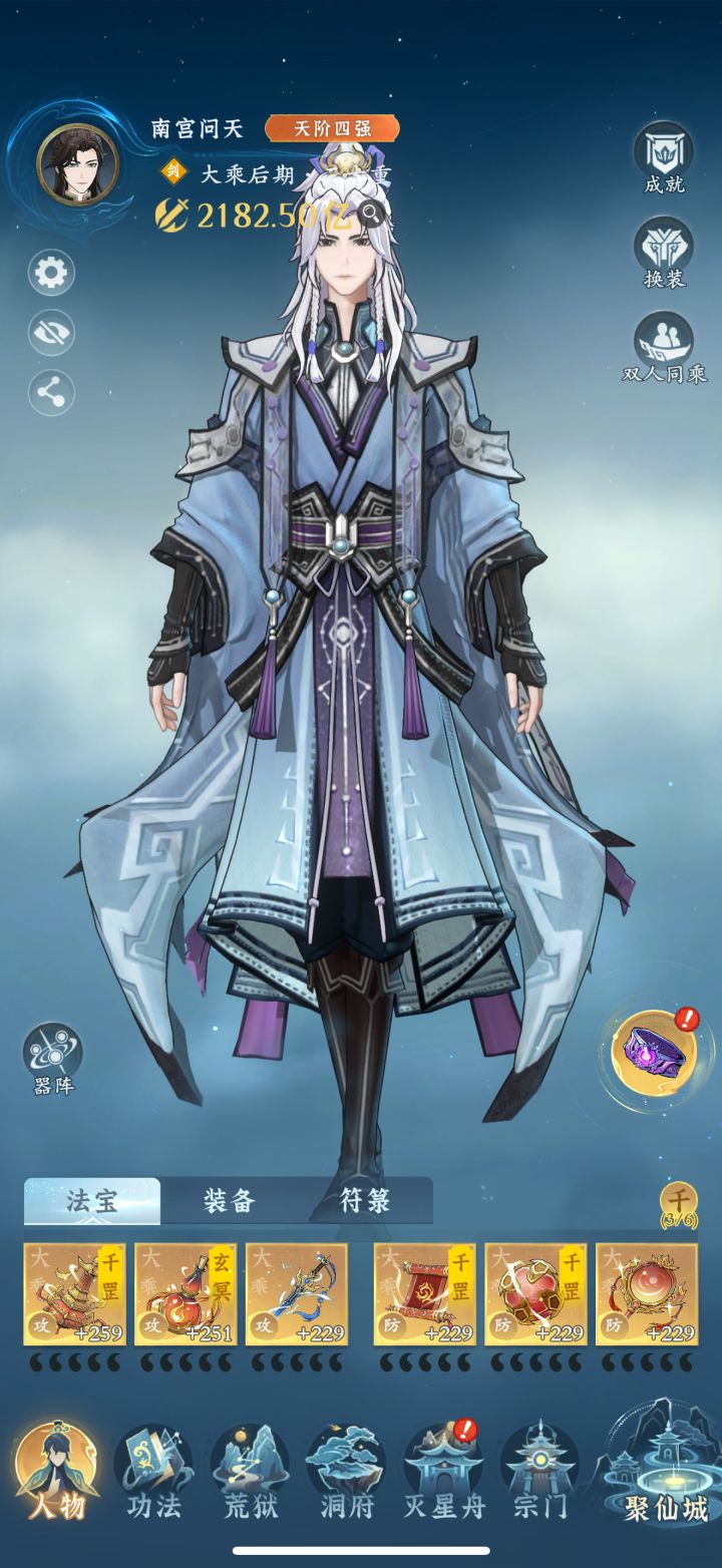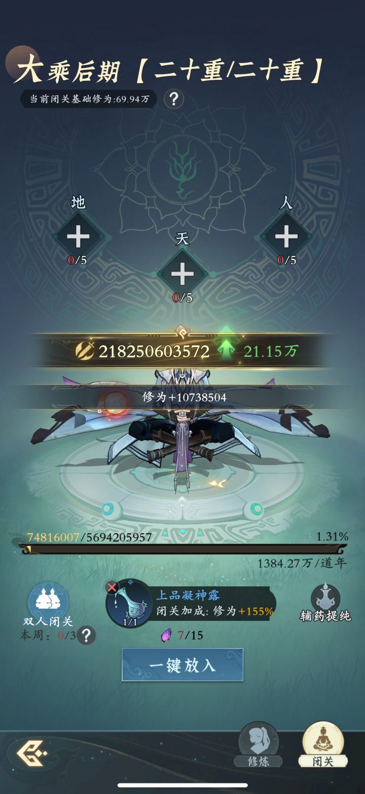 飞升还有14天,第一次玩,看了大量攻略,自己综合的,理论来说飞升神通会心250%,神通加伤20%剑系24%保守估计!掠影已经天一,后续慢慢补,心法推养不能回退,所以看你需要的词条推养,不想要的词条别推了,留着,其他的推二加30精法点就行,就着飞升用!抽的不太好,目前玩存宗门贡献个论剑币了,诸天还有一万么用,杂七杂八的,我是放弃了很多资源故意降低自己资源获取!资源我是主养的二维,攻击,会心就么了,灵