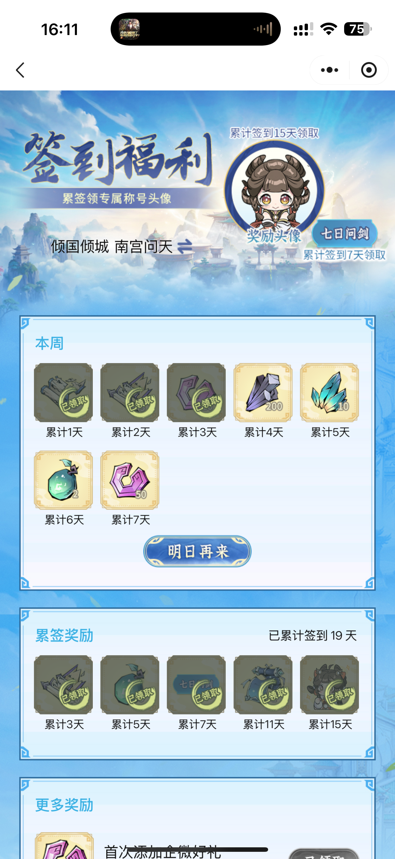 #问剑长生 时间:1月22日16点修为来到大乘后期6重4%,境界排名42,战力1924亿,玉元1.85万,签到第19天