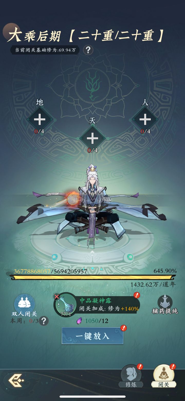 #问剑长生 时间:4月4日21点修为来到大乘后期20重645%,境界排名40,战力2328亿,玉元6.62万,签到第3天