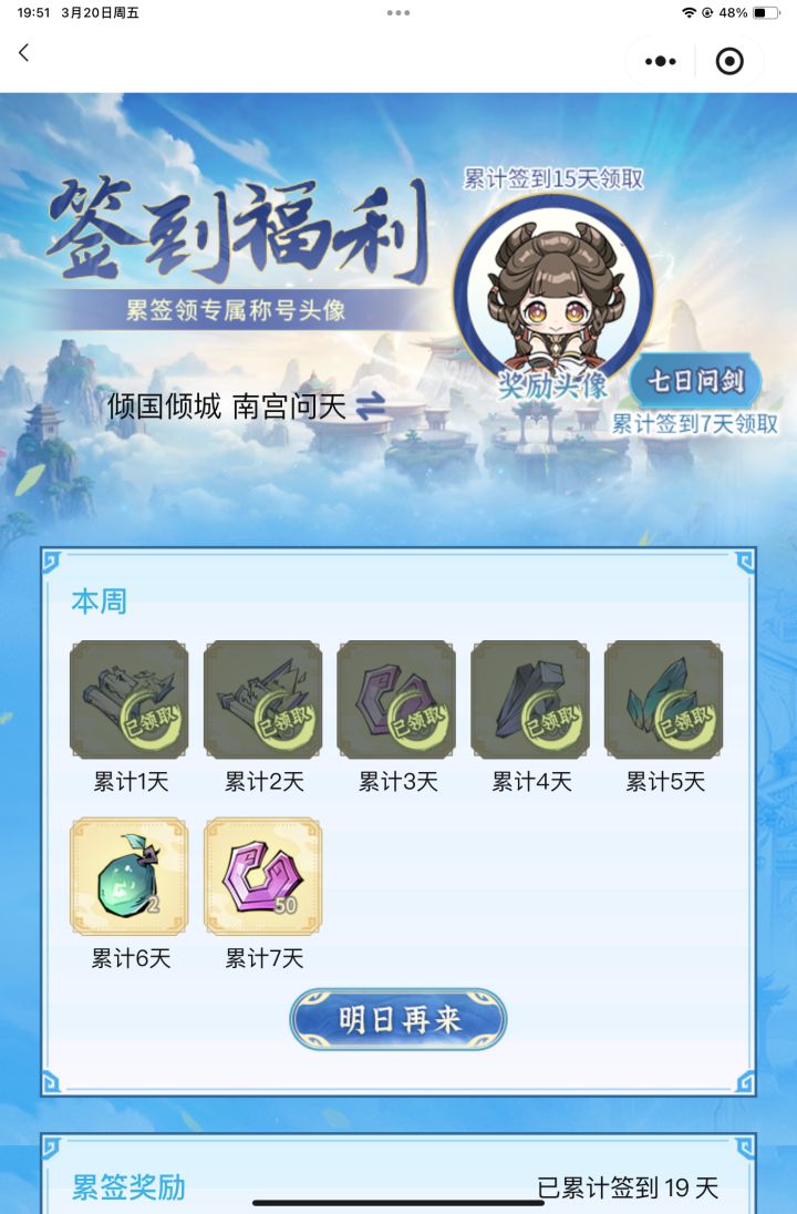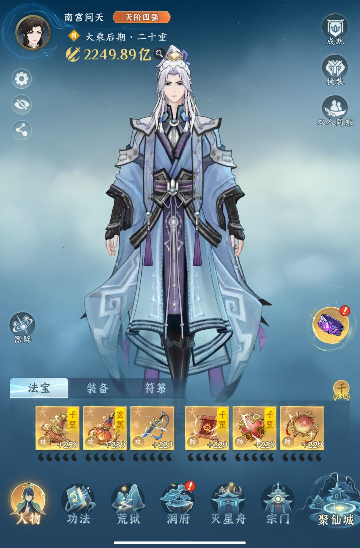 #问剑长生 时间:3月19日19点修为来到大乘后期20重280%,境界排名40,战力2244亿,玉元5.11万,签到第18天,今天翻装备偶然看到,渡劫前期?我以为直接仙界