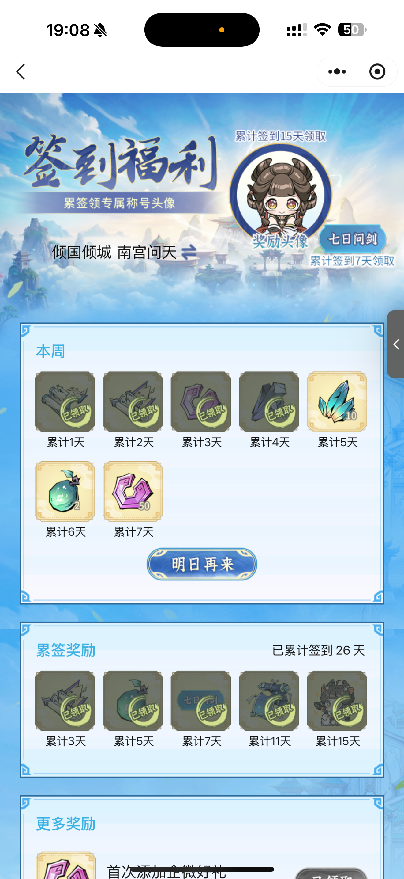 #问剑长生 时间:1月28日19点修为来到大乘后期9重28%,境界排名42,战力1974亿,玉元2.68万,签到第26天