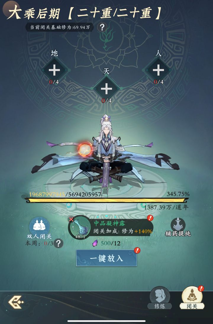 #问剑长生 时间:3月22日20点修为来到大乘后期20重345%,境界排名45,战力2261亿,玉元5.15万,签到第20天