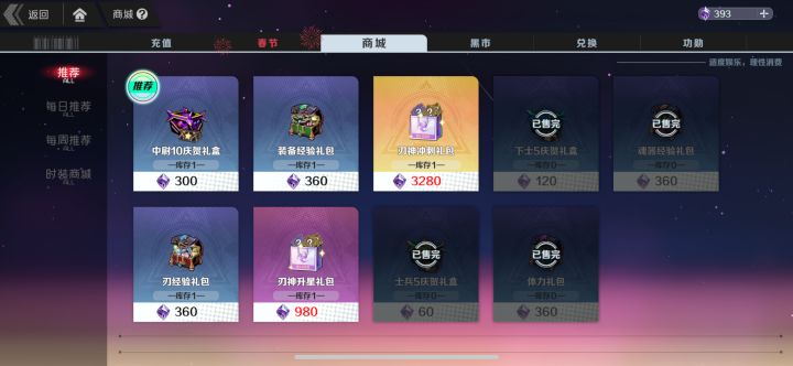 ➣目录:①氪金性价比②氪金分级③小贴士——————————正文————————①性价比首充(9元礼包=5普抽)→98块自选刃礼包(平民可忽略)→68魂器自选(性价比最高!)月卡→战令→直充36买体力礼包体力=经验=进度②氪金分级⒈0氪靠肝卖好羁绊装备→开战令(有富余再开月卡)⒉68块(最好再肝/氪360买体力礼包)这样等级进度可以在第二梯队⒊98+68+30+98+9