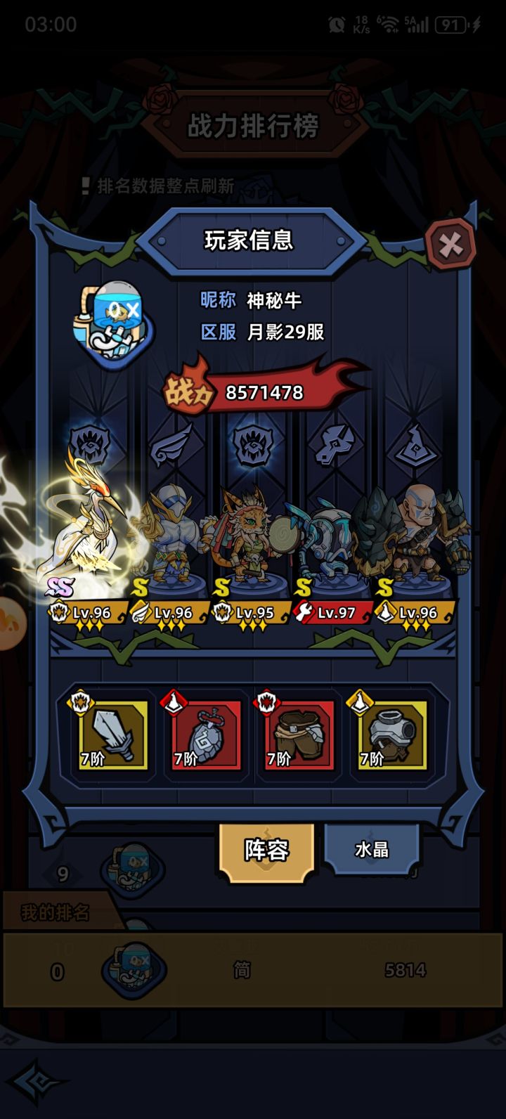 此图为本人目前阵容。相较于大氪玩家可能更适合微氪党。言归正传,前七天如何快速推到6-3是我们微氪或者三卡玩家最关心的,毕竟有自选s。(不是大氪佬随机ss真的挺难的)第一天推到第四关会有七天奖励开启。开启后送个随机卡。这时候平民玩家想开局爽就刷开局,不是飞机不玩。现阶段英雄飞机无敌。图二就是飞机。如果是懒得刷开局的玩家,随机到人族光头,神族泰坦,兽族猫女或者牛马都可以。一般大家开局的t是雅典娜。第