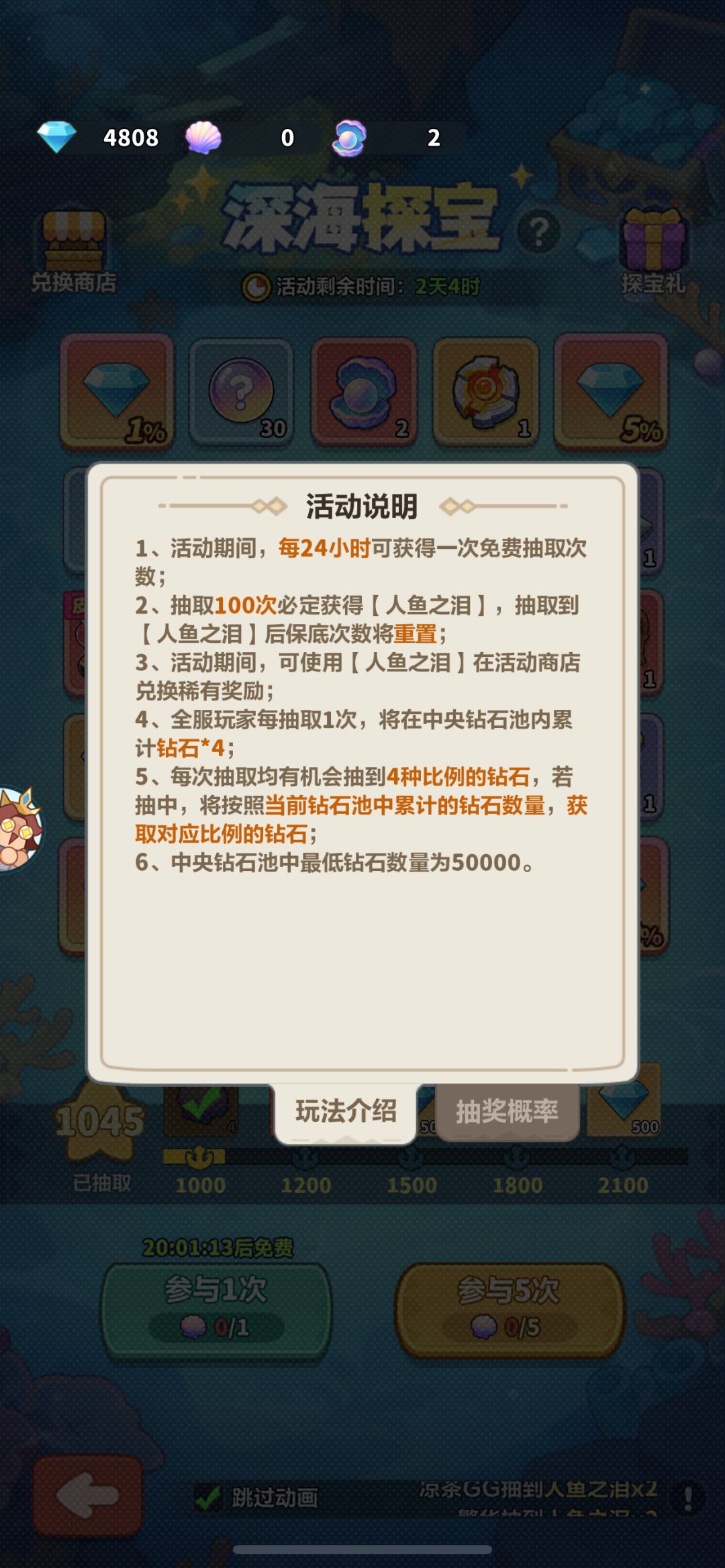 大家好,在游戏开区的第31天,也就是凛冬祈愿活动结束之后,新一轮的活动主题是深海远航,可以有很多白嫖的资源,本期,我将针对于大家比较感兴趣的深海探宝做一个攻略,希望对你有所帮助。 首先,深海探宝活动是在深海远航活动开始的第6天开启,也就是在活动结束倒计时的第20天,着急的小伙伴们可以看一下时间,避免等待或者错过。 先看一下活动奖励和概率有哪些,首先是活动的奖励,比较好的有,章鱼国王皮肤,武器皮