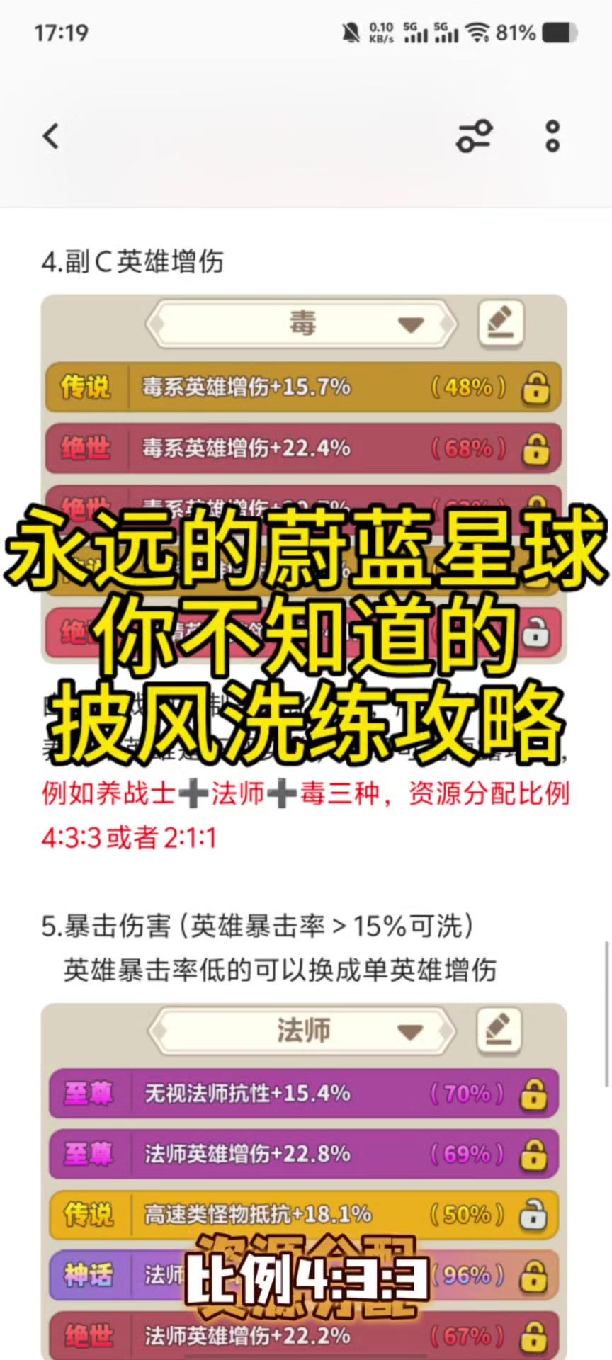 哈喽各位玩家老爷们,阿祖今天继续我们的#永远的蔚蓝星球 #蔚蓝星绽计划 ,微氪玩家最强省钱攻略系列,话不多说,系列第三篇开讲。 上一篇说了伤害的形成是由英雄面板攻击力为基础,通过英雄或者国王技能加成,加增伤加成,乘以暴击伤害,减去怪物抗性所得到的最终伤害。现在我来掰开了揉碎了好好给大家说说,如何洗练披风让你推图合作输出最大化。 首先新来的朋友建议先去看我前两篇说过的国王攻击力体系和英雄攻击力体系,