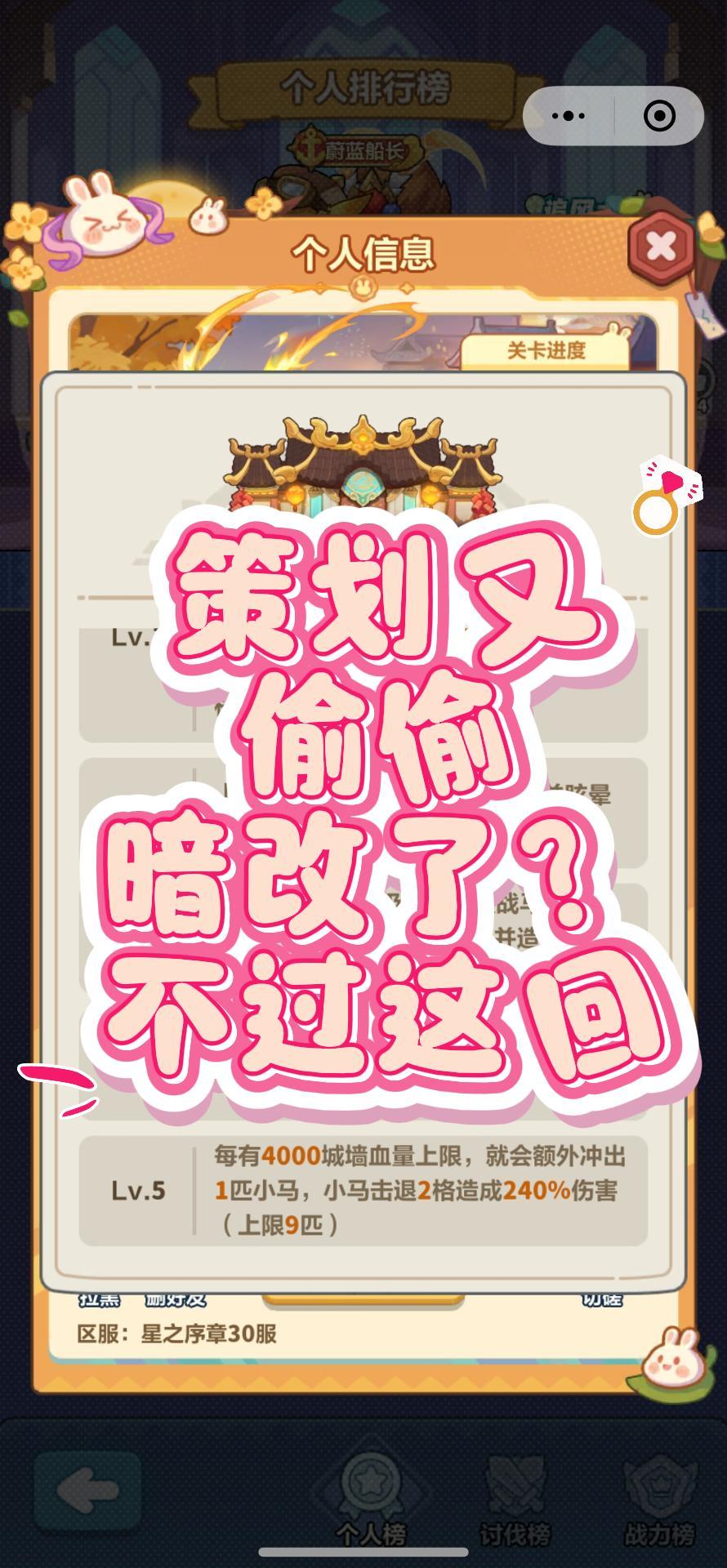 如题,今天是入坑第5天,暂时只充了首充和双月卡,看了不少攻略都说要憋到第8天再开始抽,于是这套阵容从第2天玩到现在一点也没变过,关键是抽不到安妮(新手招募抽了1轮400抽,抽到6,7次闪电加1个浣熊),玩什么模式都特憋屈这类竖屏小游戏也玩过一些,包括麦芬、英雄没有闪之类的,也有这种攒资源到活动期间用掉的模式,但是这俩游戏前7天都是在快速成长的,在持续引入的新的成长维度中不断完成阶段目标、获得爽感