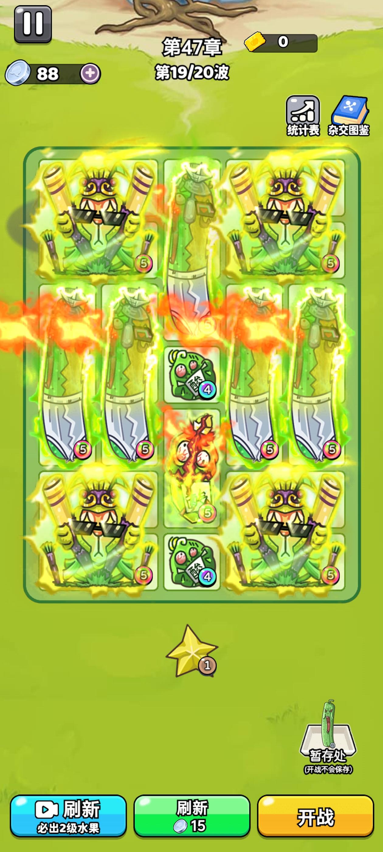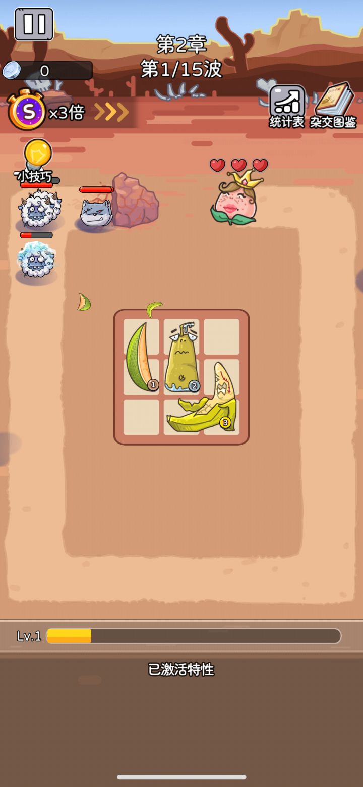 但局内摆放格子有限,每个食物格子不同,如何取舍就很关键。西瓜爆炸群攻效果好但是占格子较多,升级难度大,香蕉,蘑菇,虽然减速带毒伤,但格子又奇形怪状,不好搭配阵型,好不容易较劲脑汁搭配好后,却又摇不到自己想要的水果升级,一场对局下来感觉脑袋都要长芽儿了,最终看着自己搭配出的阵容完美过关,别提多有成就感了,心想我真是收纳小天才。